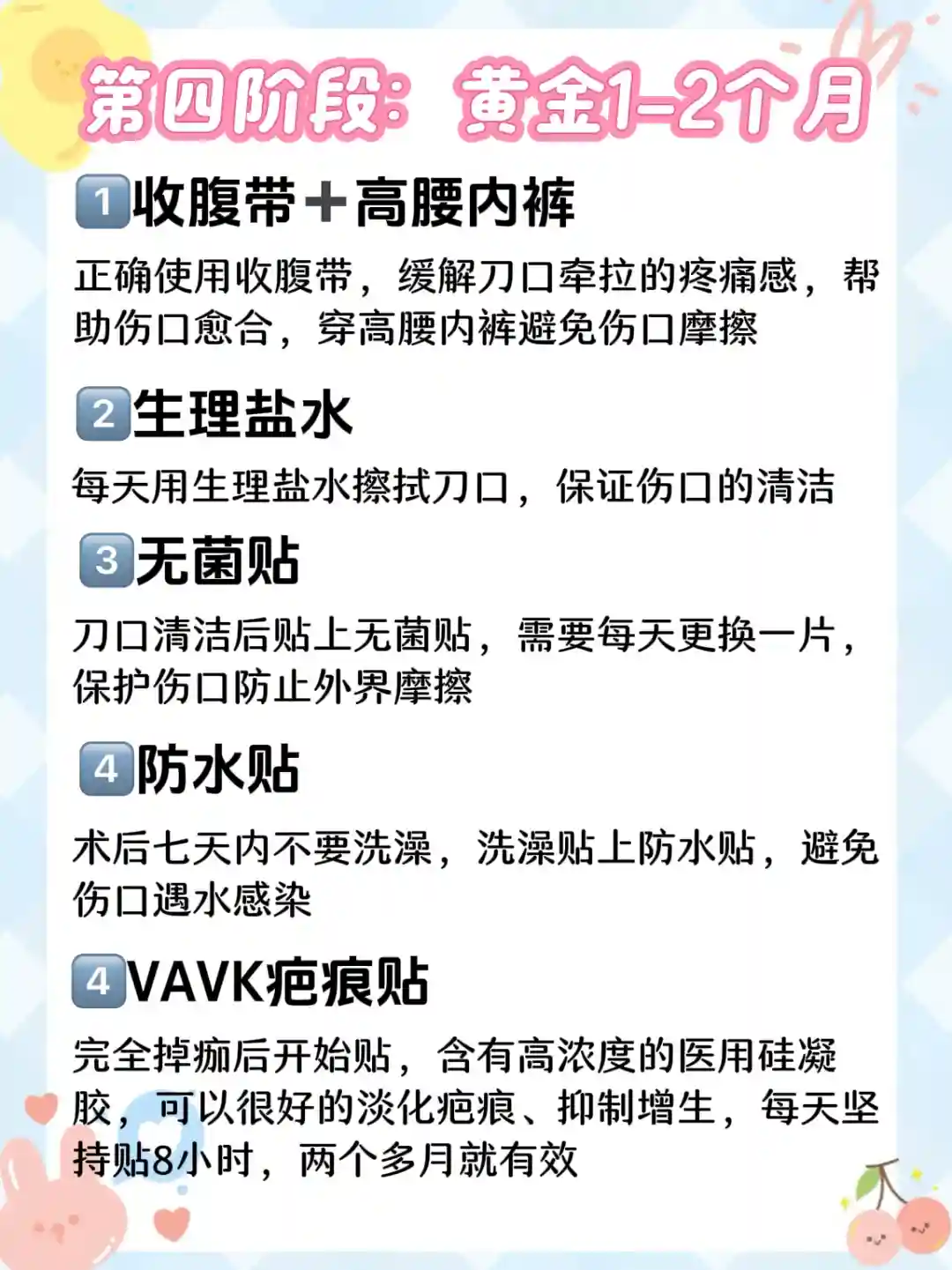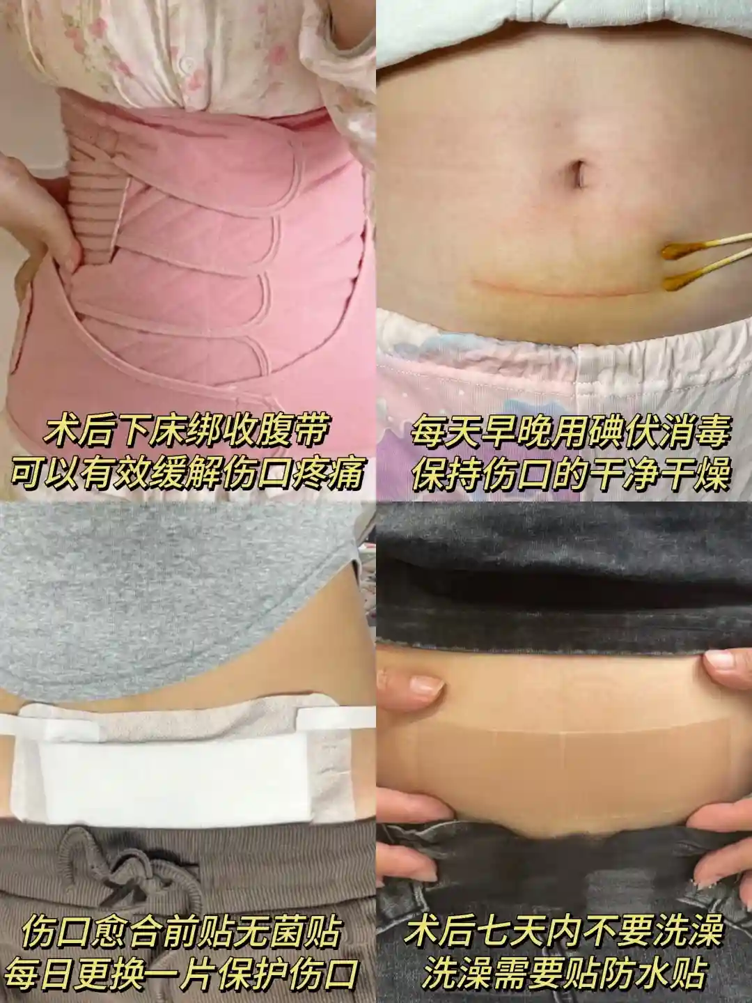 正确使用收腹带,缓解刀口牵拉的疼痛感,帮助伤口愈合,穿高腰内裤,避免伤口摩擦