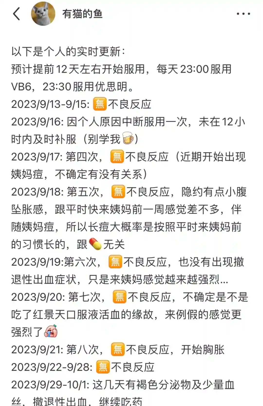 2023/9/22-9/28: 🈚️不良反应2023/9/29-10/4: 这几天有褐色分泌物及少量血丝,判断为撤退性出血,每天使用护垫,并继续吃药。目前🈚️不良反应,算是拦截成功了!