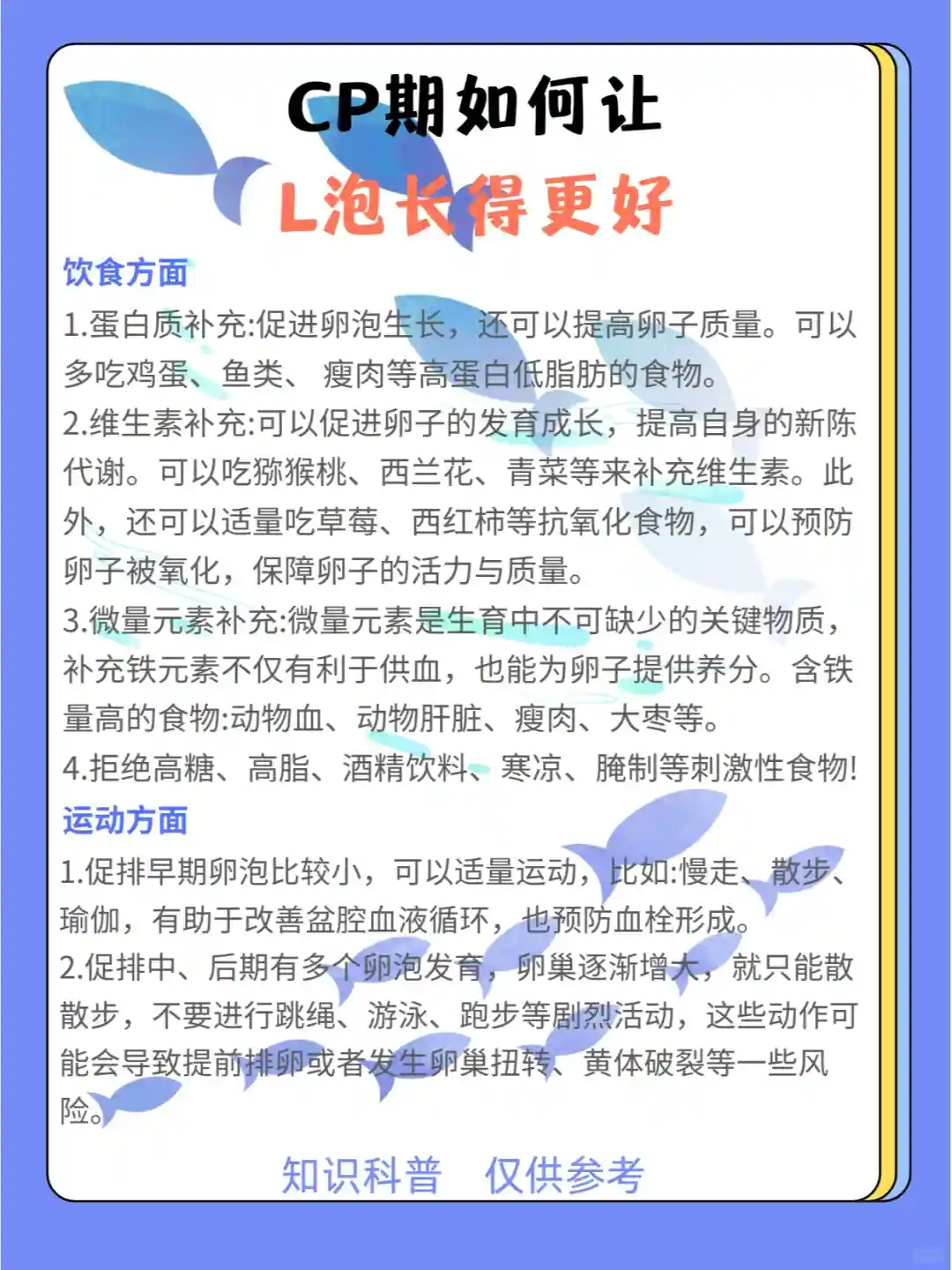 1.蛋白质补充:促进卵泡生长,还可以提高卵子质量。可以多吃鸡蛋、鱼类、 瘦肉等高蛋白低脂肪的食物