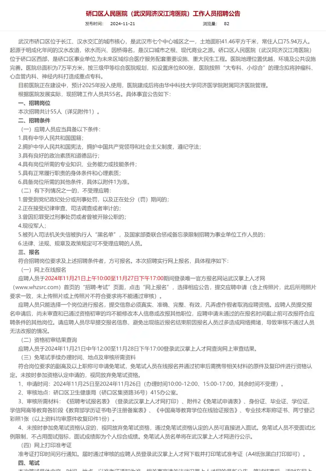 2.资格初审结果查询:应聘人员于2024年11月21日中午12:00至11月28日下午17:00登录武汉掌上人才网查询网上审查结果。