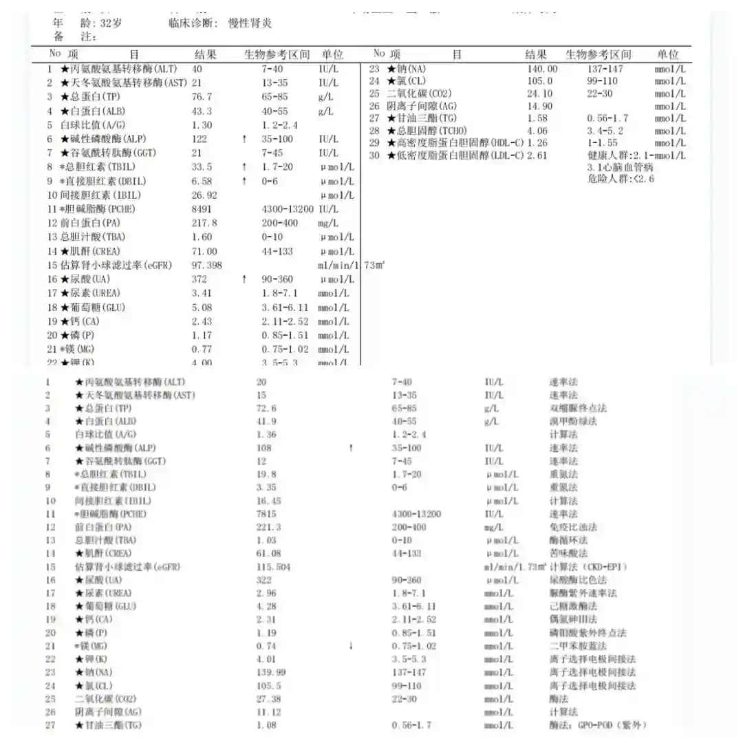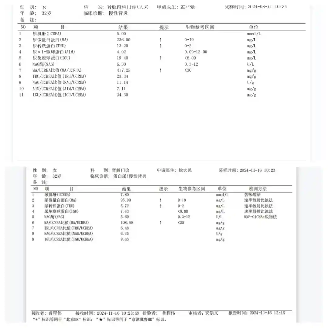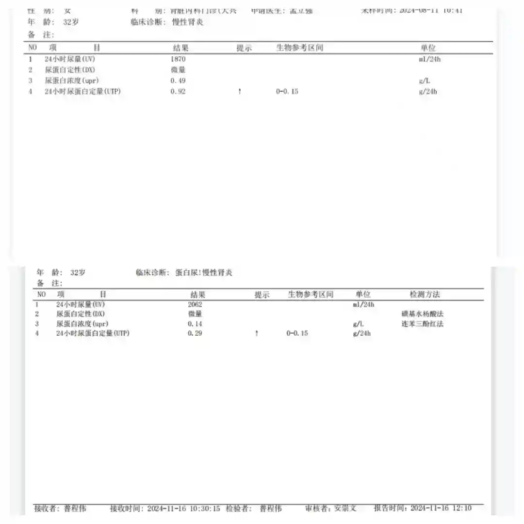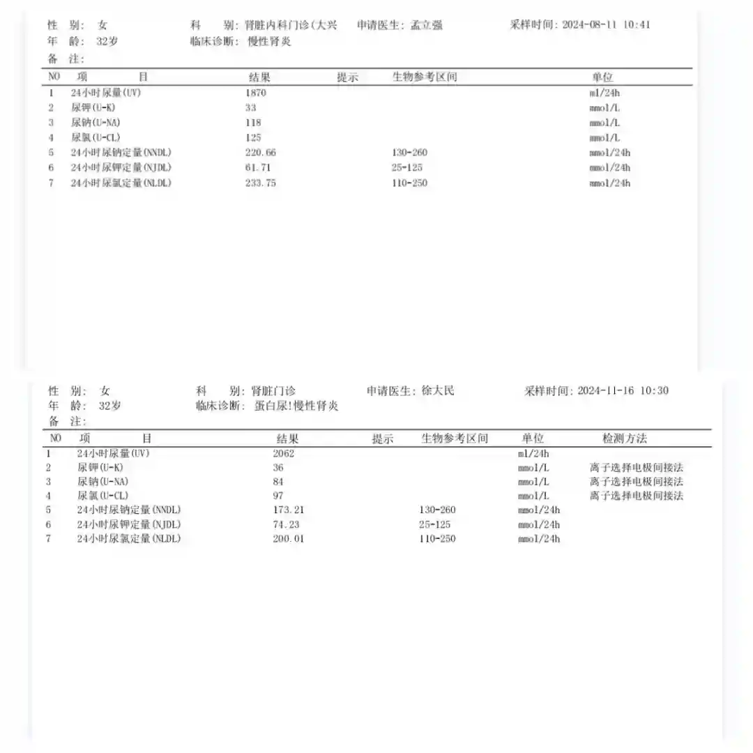 尿蛋白定量从0.92降到了0.29,肌酐从71降到了61,尿钠离子含量从220降到173。