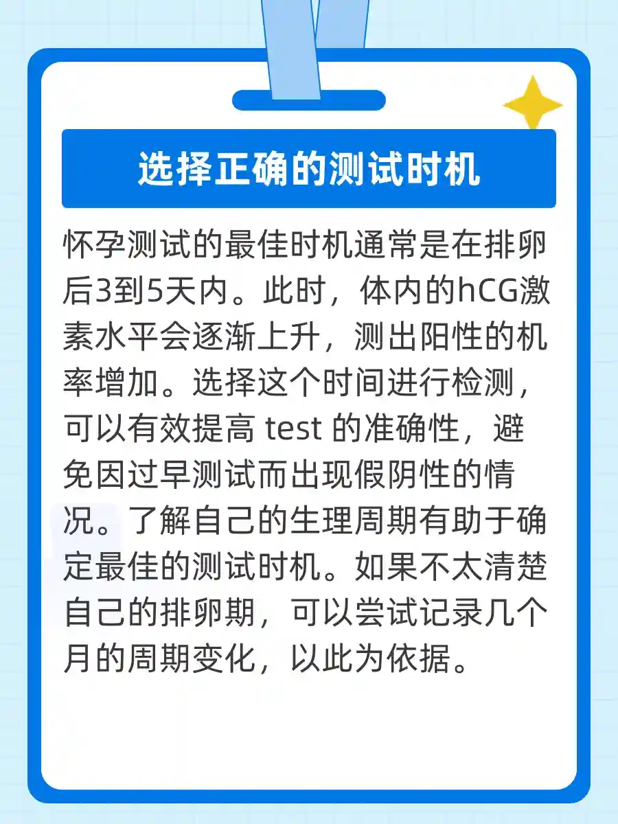 如果你在排卵期后等了3到5天再进行测试,那就选对时间了!这个时候,若是怀孕,体内的hCG(人绒毛膜促性腺激素)会开始分泌,相信我,你的测试棒会给你一个惊喜!🎉