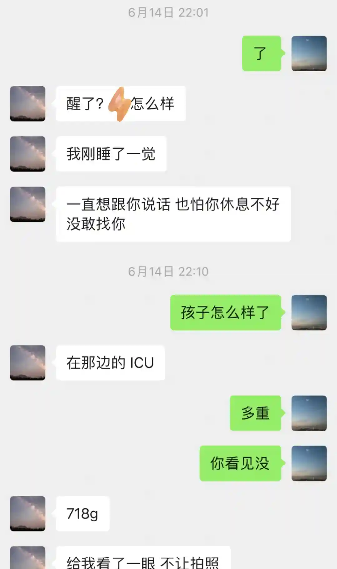 。推回ICU护士和护工妥善的照顾了我,我还没完全恢复麻醉。也不知道过了多久医生过来压肚子我也迷迷糊糊的,都没觉得疼,后面压肚子其实也没疼不知道为啥。直到15:00家属探视时间我妈才看见我,迷迷糊糊话也说不清,眼也睁不开16:00又走了。孩子是中午出生,我到晚上22:00才缓过来拿的起手机,迫切想问一下孩子情况,回头看真名场面。