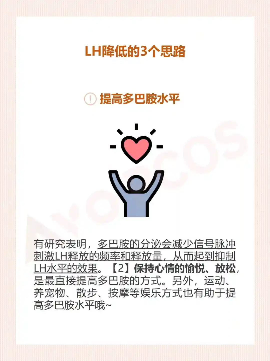 🔸保持心情的愉悦、放松,是最直接提高多巴胺的方式。另外,运动、养宠物、散步、按摩等娱乐方式也有助于提高多巴胺水平哦~
