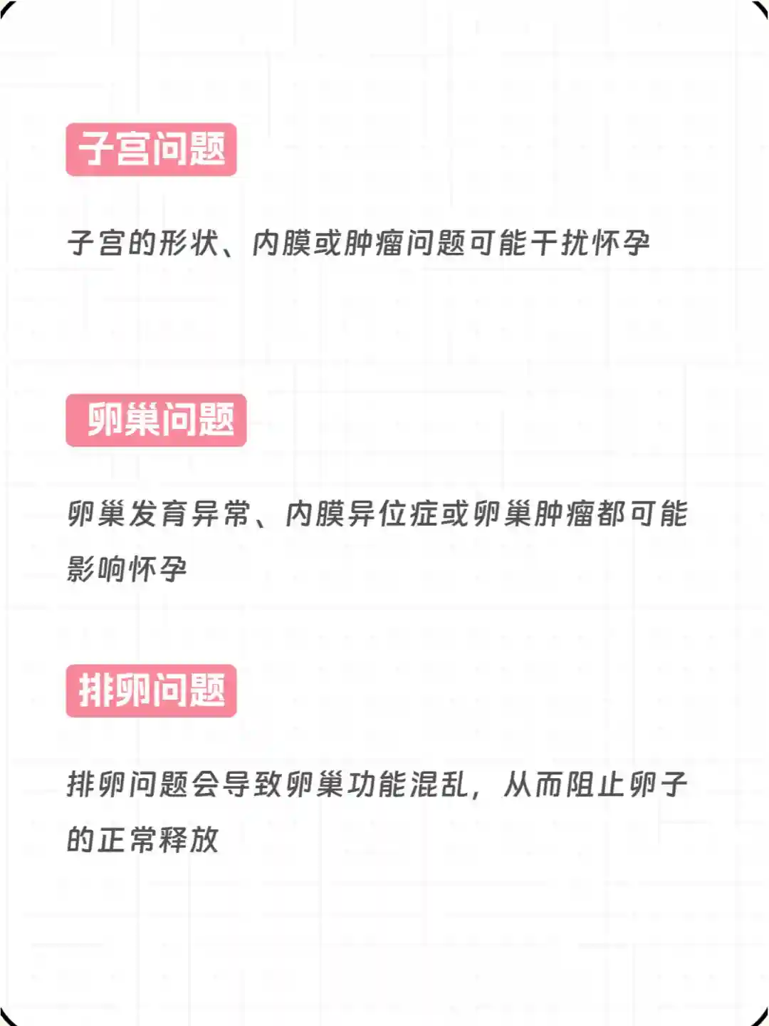 3. 输卵管问题:输卵管的功能是输送精子、捡起卵子,并将受精卵送到子宫. 输卵管问题最常见,可能包括发育不全、炎症等.