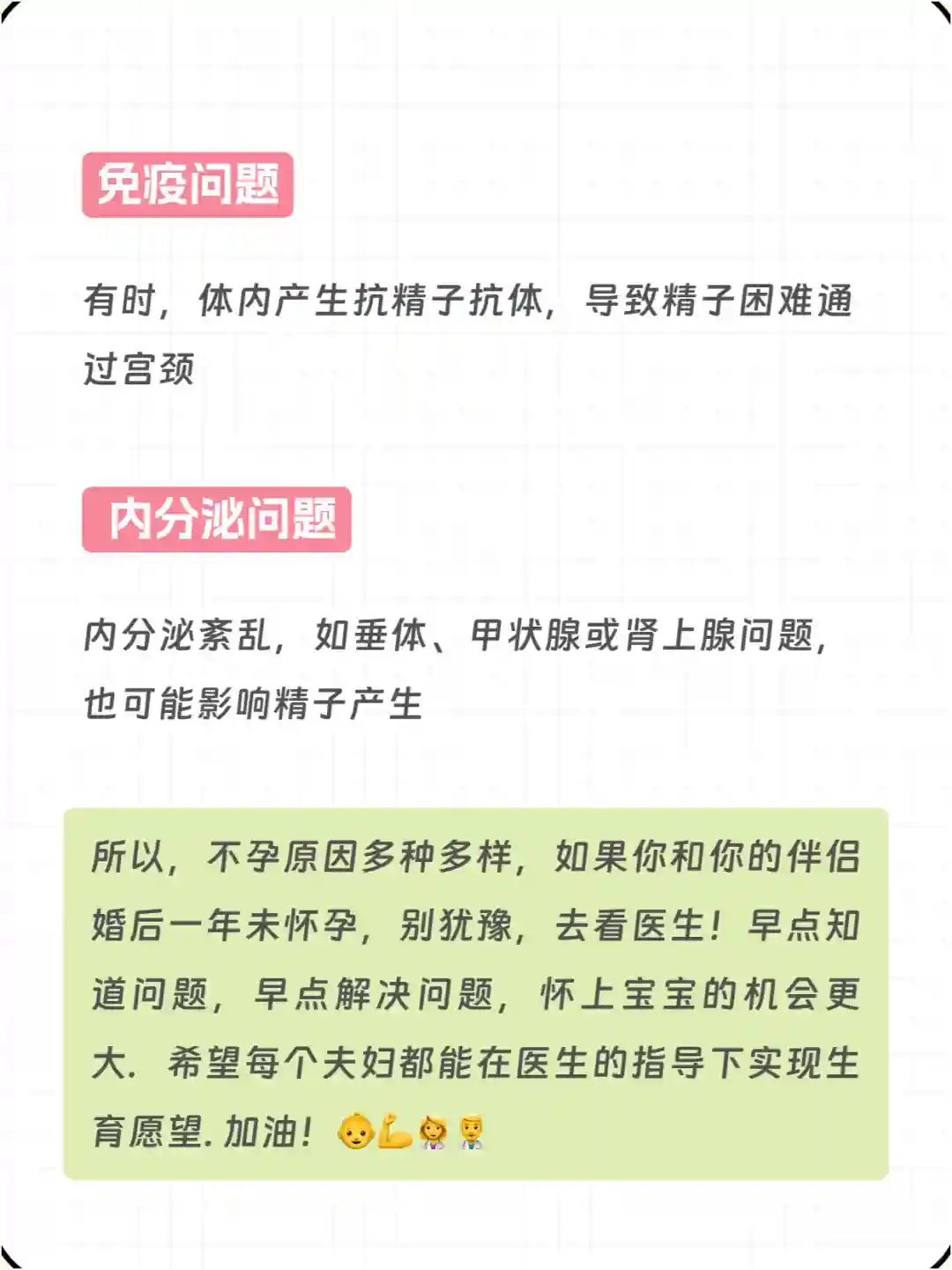 11. 内分泌问题:内分泌紊乱,如垂体、甲状腺或肾上腺问题,也可能影响精子产生.所以,不孕原因多种多样,如果你和你的伴侣婚后一年未怀孕,别犹豫,去看医生!早点知道问题,早点解决问题,怀上宝宝的机会更大. 希望每个夫妇都能在医生的指导下实现生育愿望. 加油!👶💪👩⚕️👨⚕️ #辅助生殖 #试管婴儿 #不孕不育 #试管之路 #试管保险 #小确保试管保险