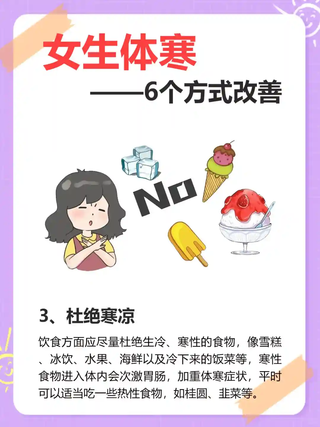 饮食方面应尽量杜绝生冷、寒性的食物,像雪糕、冰饮、水果、海鲜以及冷下来的饭菜等。