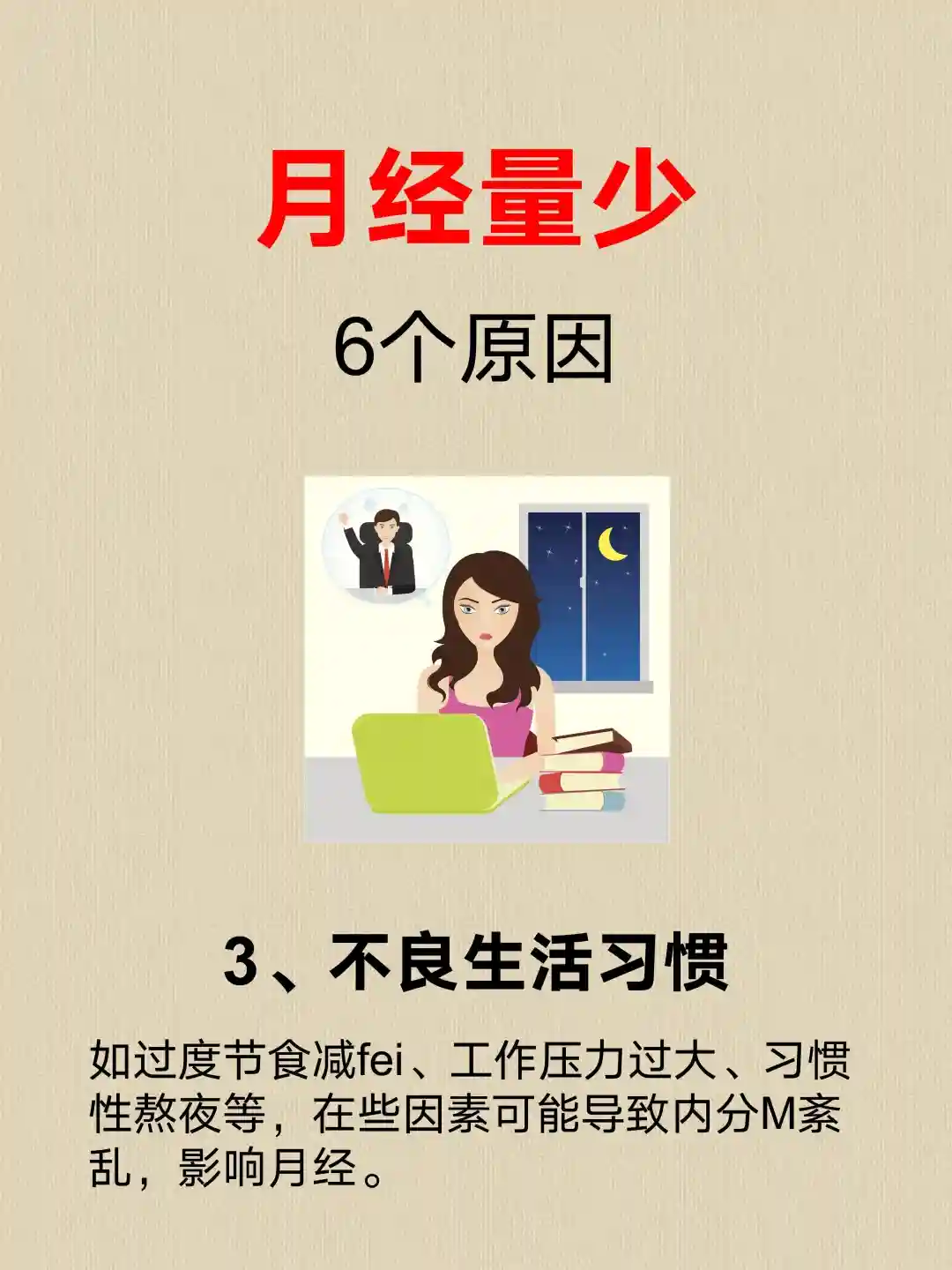 3、不良生活习惯:如过度节食减肥、工作压力过大、习惯性熬夜等,这些因素可能导致内分泌紊乱,影响月经。