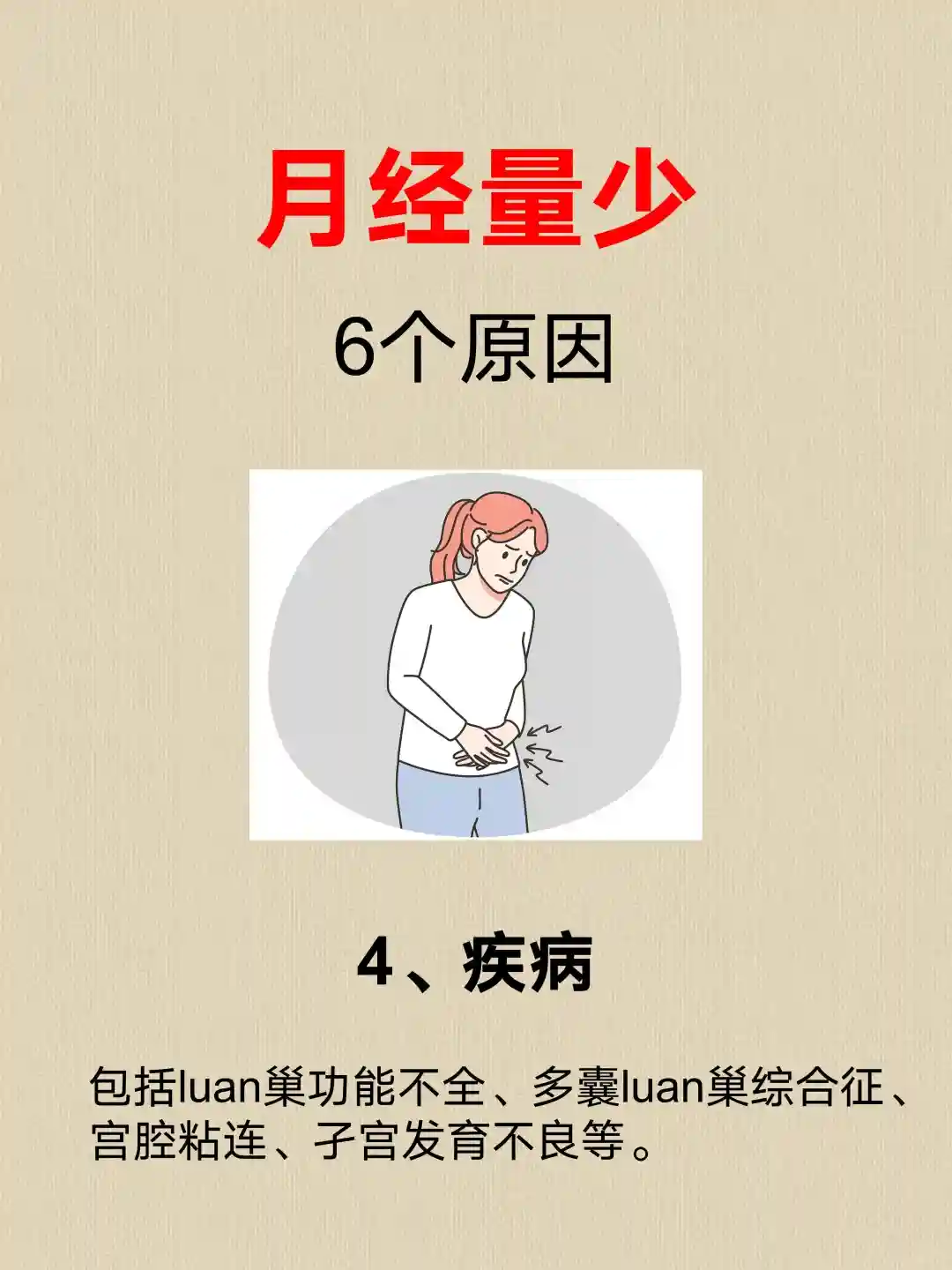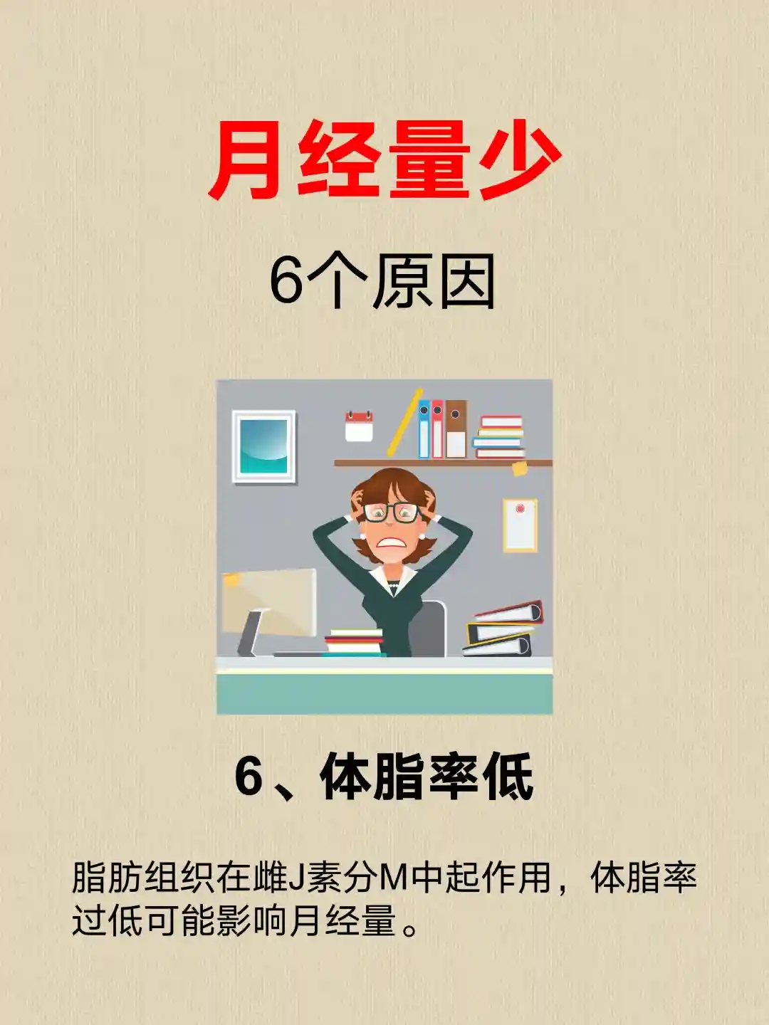 5、体脂率低:脂肪组织在雌激.素分泌中起作用,体脂率过低可能影响月经量。