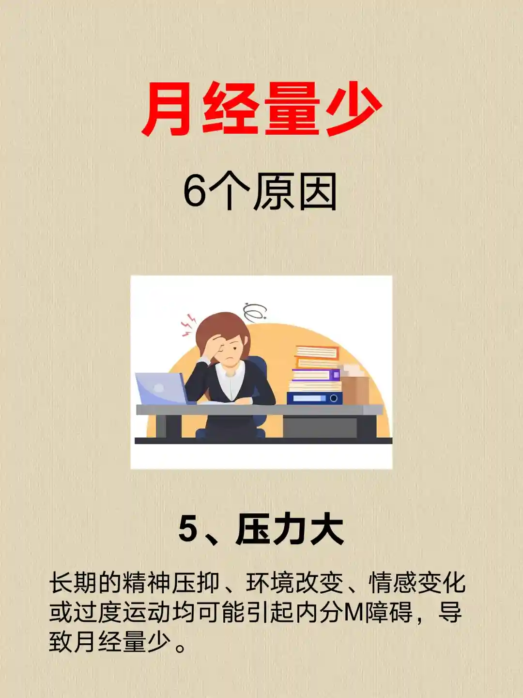 4、压力大:长期的精神压抑、环境改变、情感变化或过度运动均可能引起神经内分泌障碍,导致月经量少。
