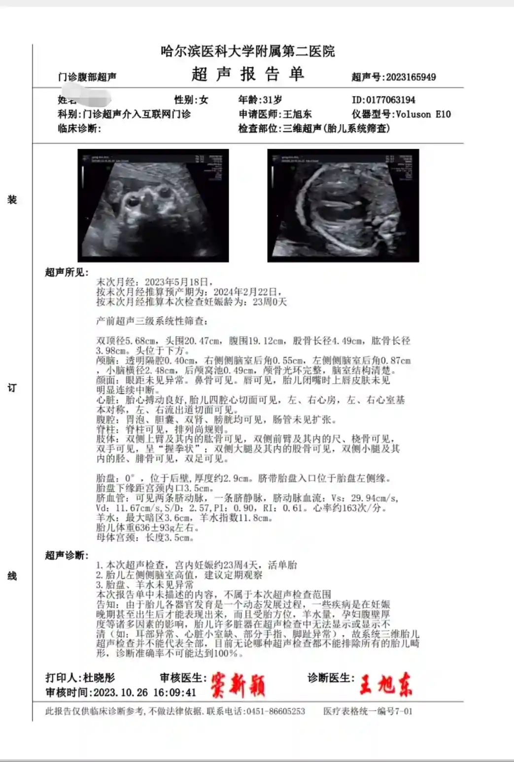 本来大排畸是打算在佳木斯做的,但是在沈阳羊穿时主任说三代试管建议找个好一点的做,通过咨询及朋友推荐,选择哈尔滨医大二院的王旭东主任,当时挂号还算顺利也很幸运,现在根本都约不到(挂号具体过程就不讲了,真是太难约了),大排畸约的是下午做,崽崽不配合五进五出都没完事,王主任很负责说有一只手总是攥拳没看清手指,第二天早上又去的,左侧后脑室高值我看了很担心,王主任说不超过一,后期观察定期复查会慢慢吸收。人火是有原因的,看的非常细致,等候的时候好几个在别的医院检查有问题的,都建议找他在看一下,人也是又高又帅
