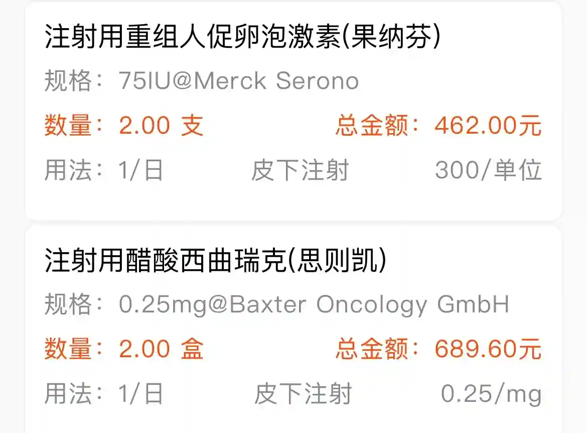 开了两盒思则凯,每天0.25mg,两盒75iu小果纳芬(大果剩了150iu,一起凑300iu,小果比大果疼一点点)