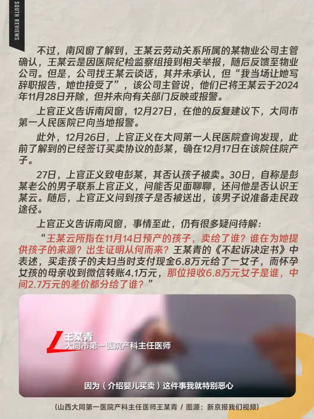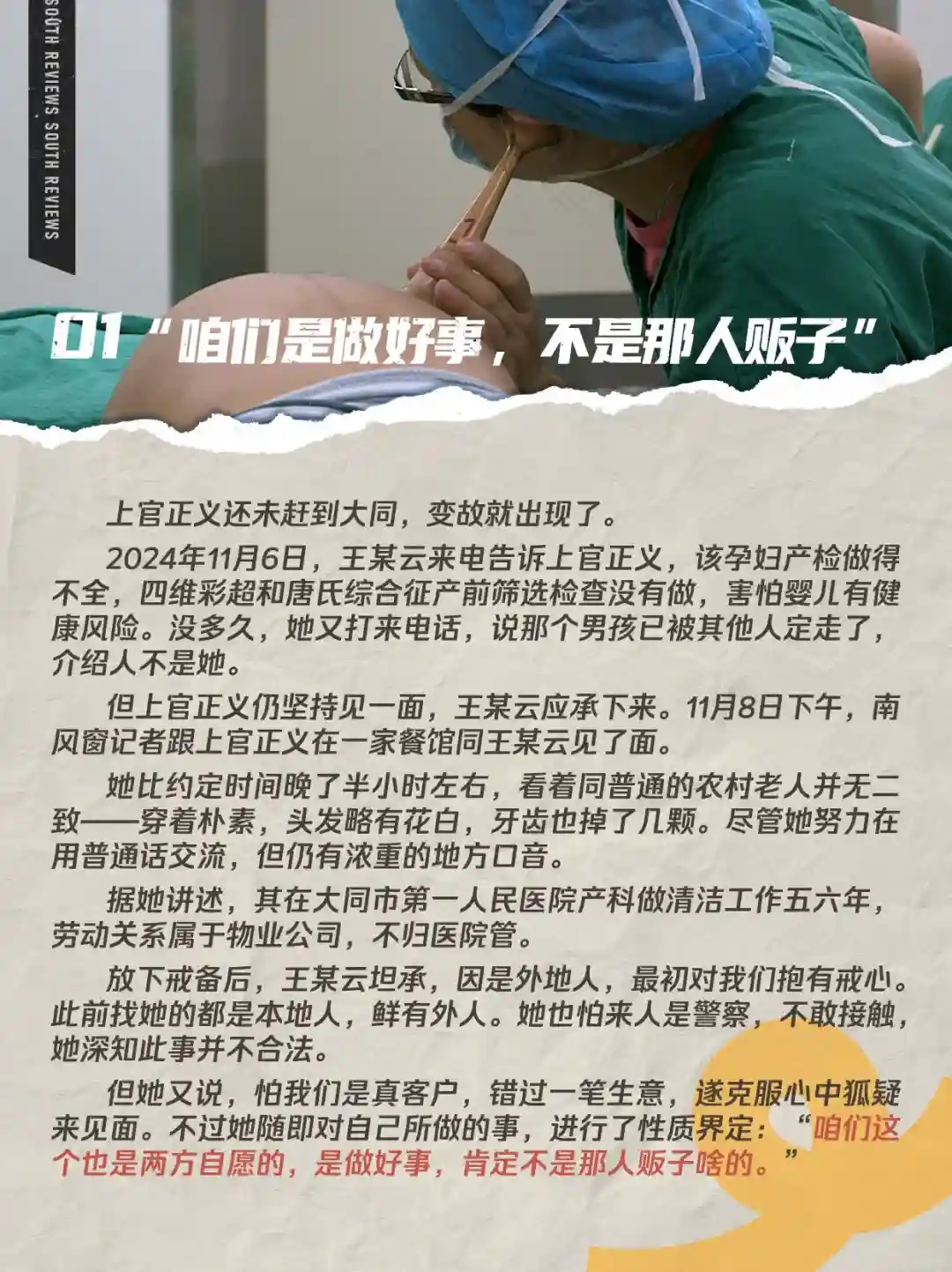 2024年11月8日,南风窗记者同上官正义一起前往大同,跟王某云线下见面。她坦承了自己介绍买卖孩子的事实,并将其称为“做好事”。同时,她说医院某位产科主任也曾参与此事。