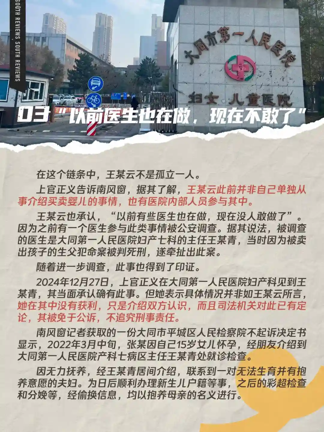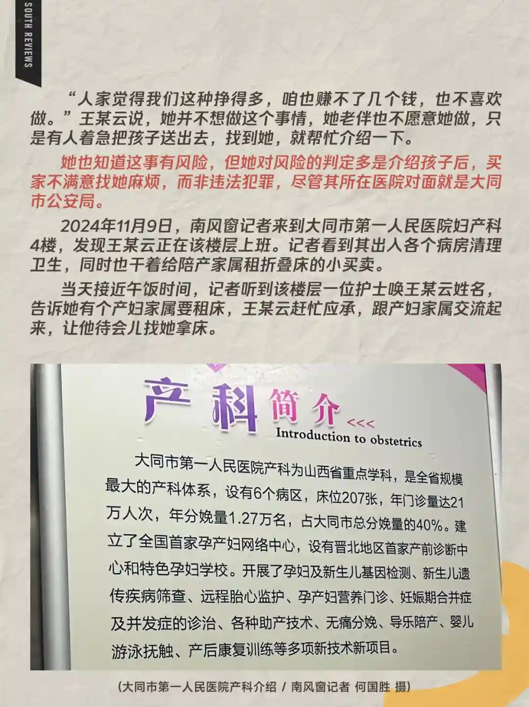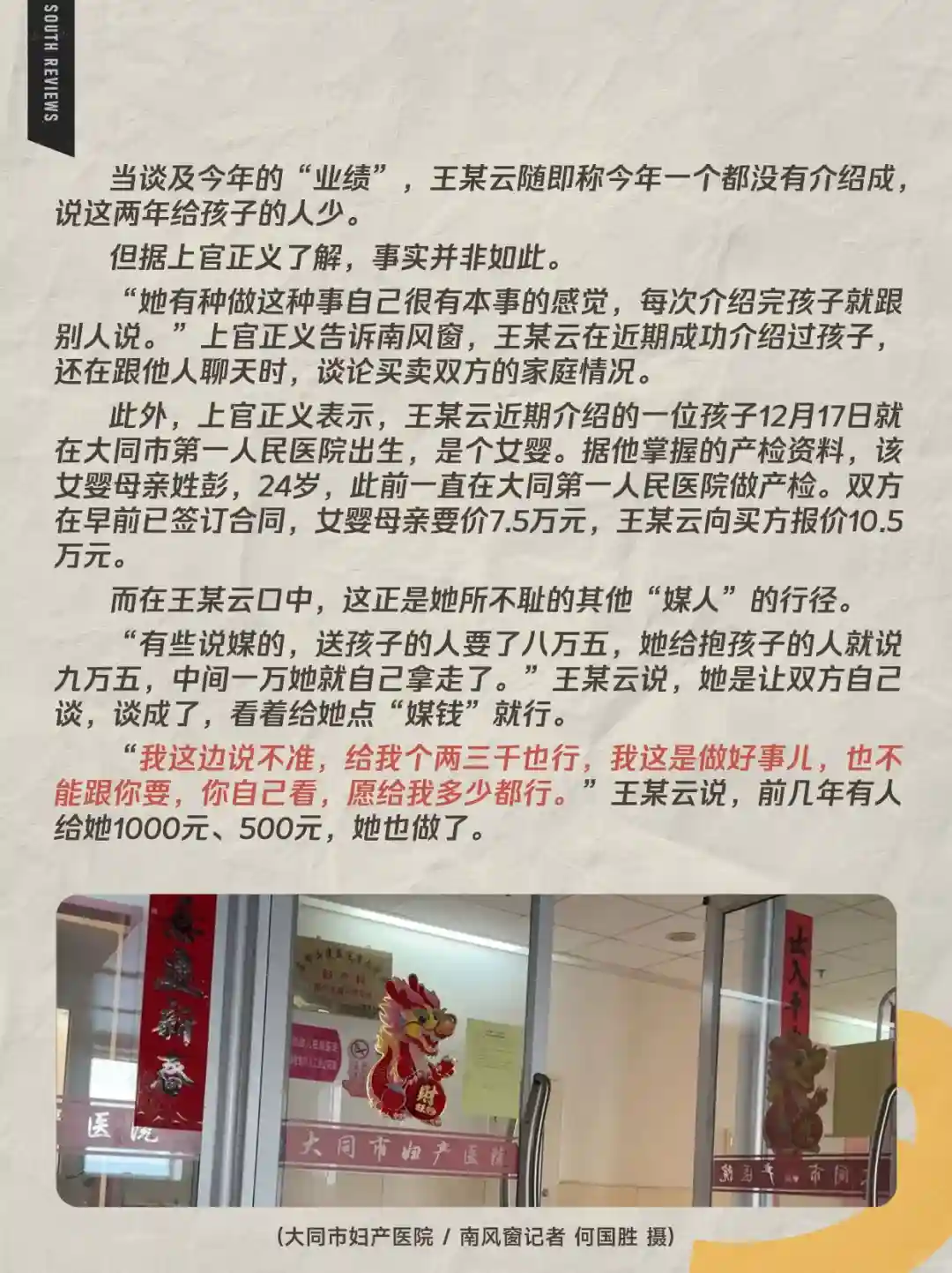 上官正义告诉南风窗,他了解到,只要去大同第一人民医院产科4楼找到王某云,说想要个孩子,她就会跟人介绍情况。王某云在大同第一人民医院产科干保洁工作良久,有人生了孩子不想抚养,就找她帮忙寻买家,她从中赚取介绍费。