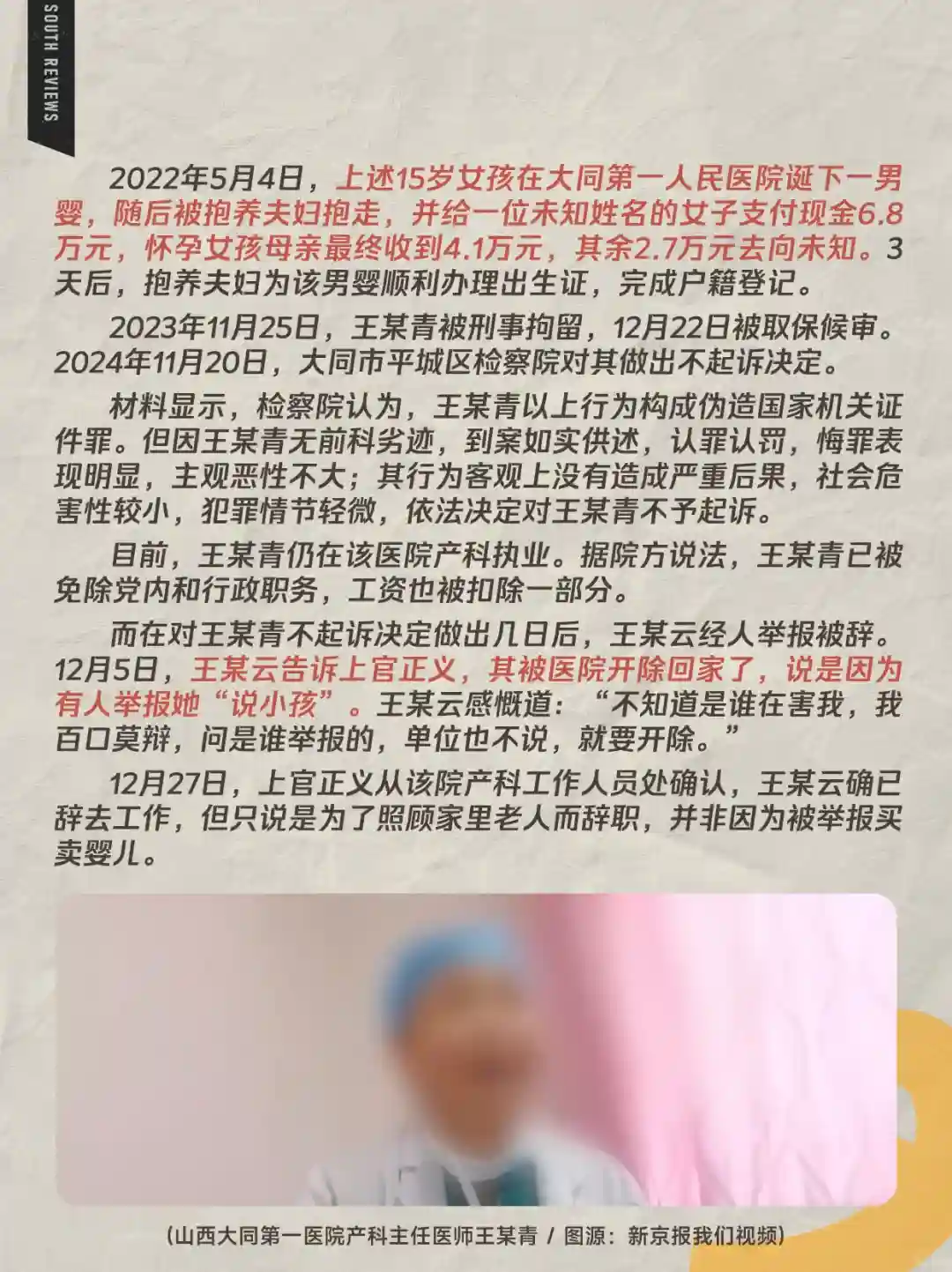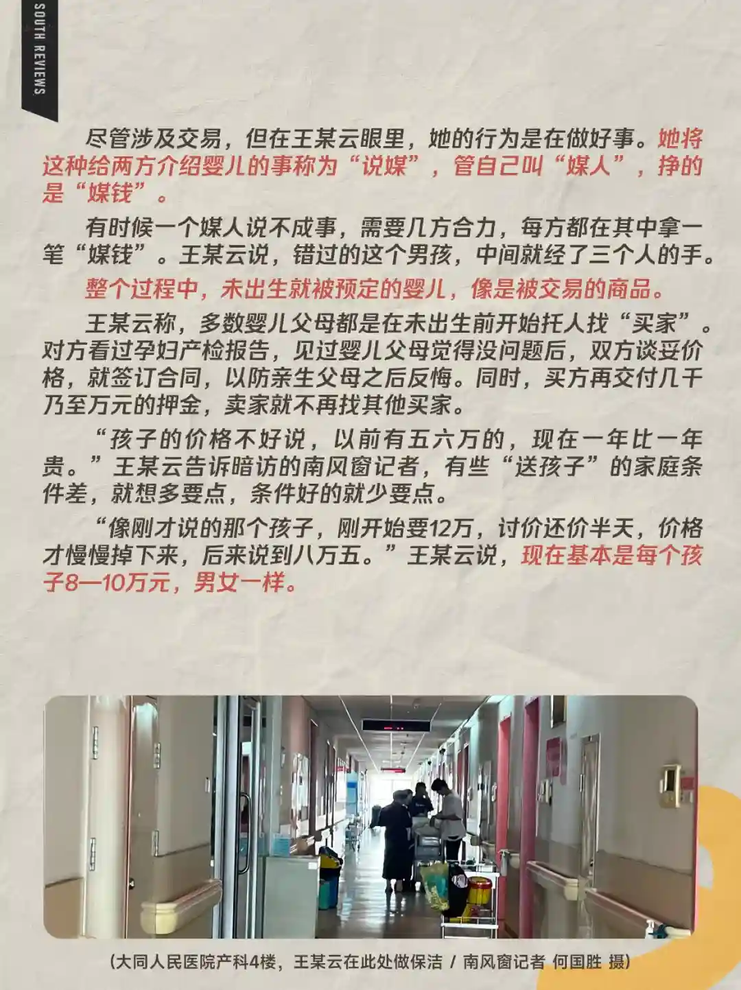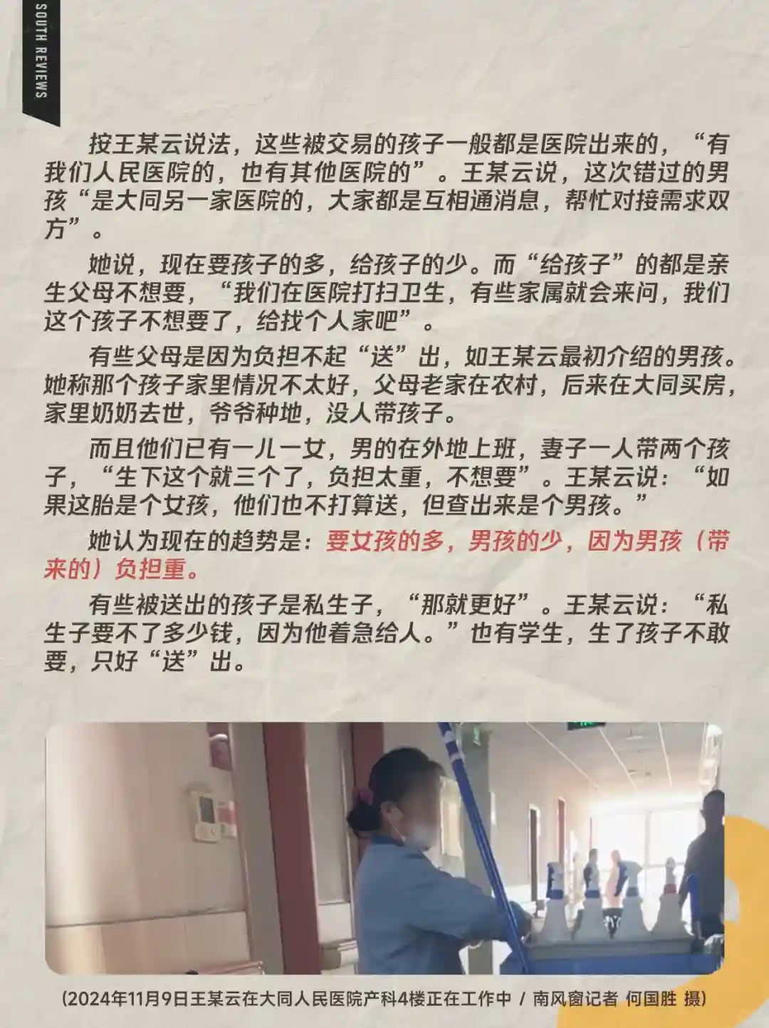 上官正义告诉南风窗,他了解到,只要去大同第一人民医院产科4楼找到王某云,说想要个孩子,她就会跟人介绍情况。王某云在大同第一人民医院产科干保洁工作良久,有人生了孩子不想抚养,就找她帮忙寻买家,她从中赚取介绍费。