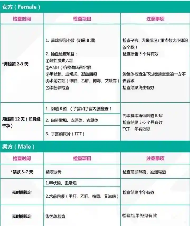 血常规, ABO 血型鉴定, RH 血型, 肝功五项,肾功四项,传染病项目:,甲肝抗体,乙肝两对半,丙肝抗体,艾滋病抗体,梅毒血清,甲状腺功能三项,优生五项/致畸五项,凝血四项,G6PD 筛查,地贫基因,妇科检查 (支原体, 衣原体。 白带常规, 淋球菌),尿常规,抗缪勒民营激素 AMH 定量检测。男方需要检查项目: