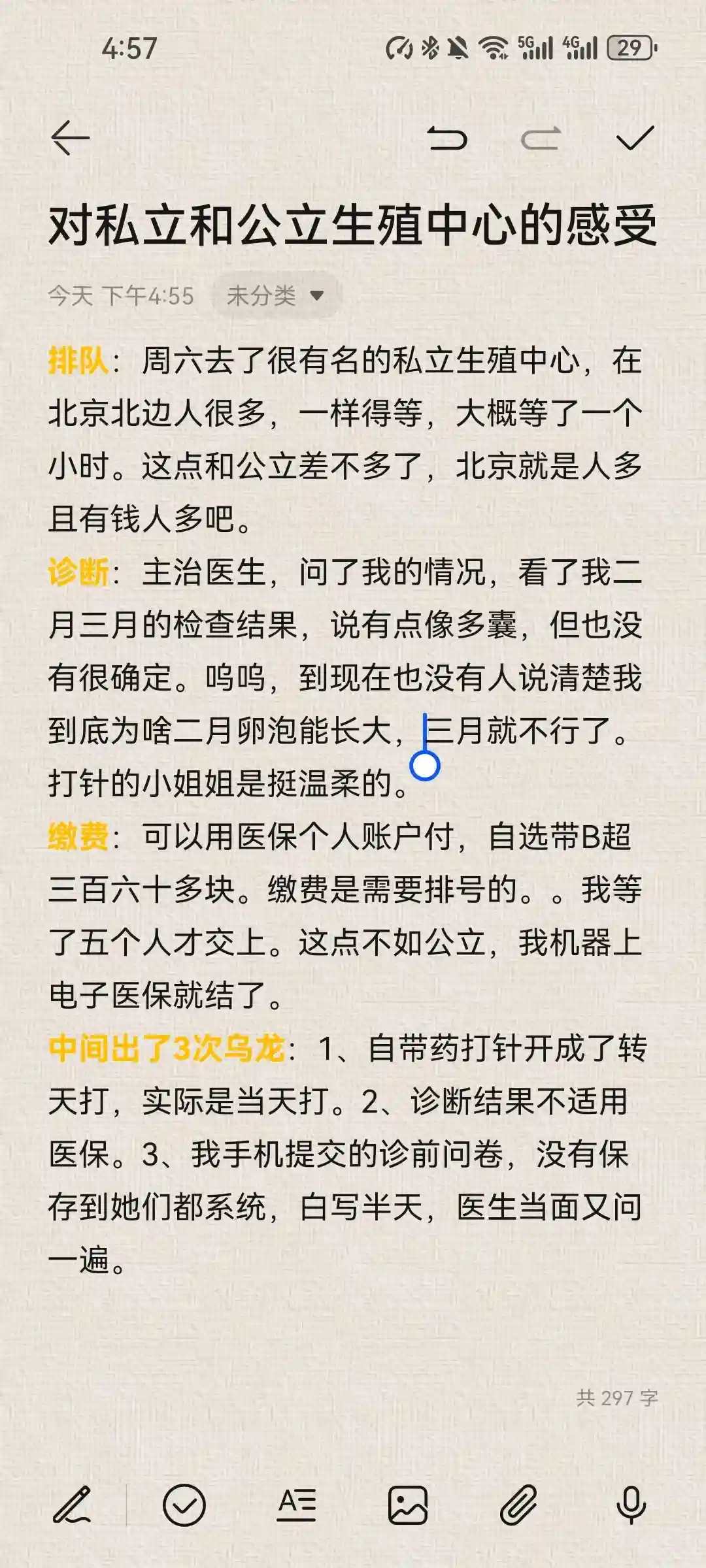 中间出了3次乌龙:1、自带药打针开成了转天打,实际是当天打。2、诊断结果不适用医保。3、我手机提交的诊前问卷,没有保存到她们都系统,白写半天,医生当面又问一遍。#备孕 #这个模板有点东西