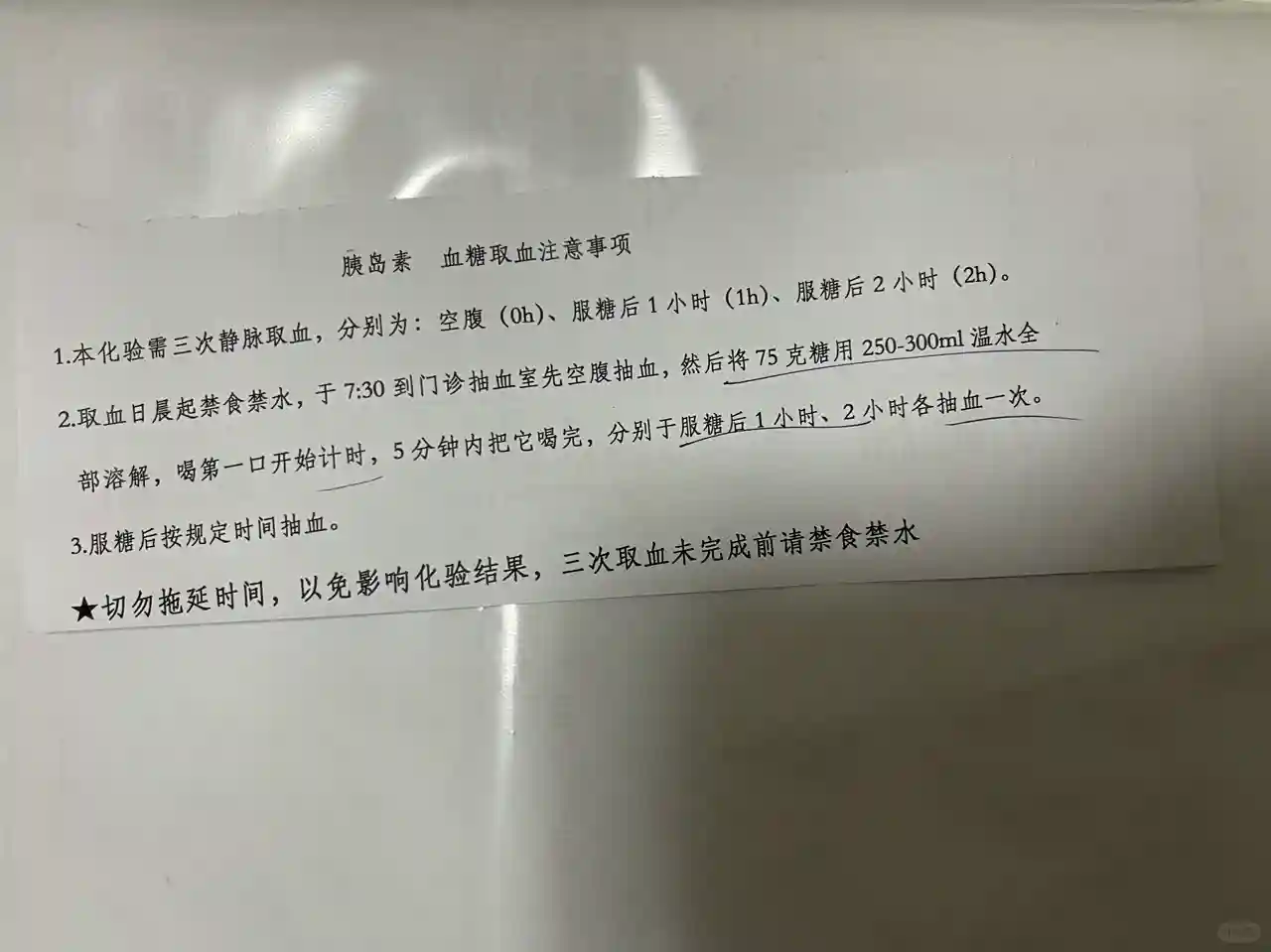 3、#抽血,等抽血的时候评估下等待时间,如果时间较长留一个人等待,另外一个人去做别的检查。还好我们前面没多少人,很快就排到了,我抽了10管血🤣,加上前一天加班就睡了半个小时,整个人丧尸状态。大夫还给开了1小时后的胰岛素及血糖,2小时后的胰岛素及血糖,所以第一次抽完血马上喝糖水,记下一小时后的时间,快速转战下一个战场。