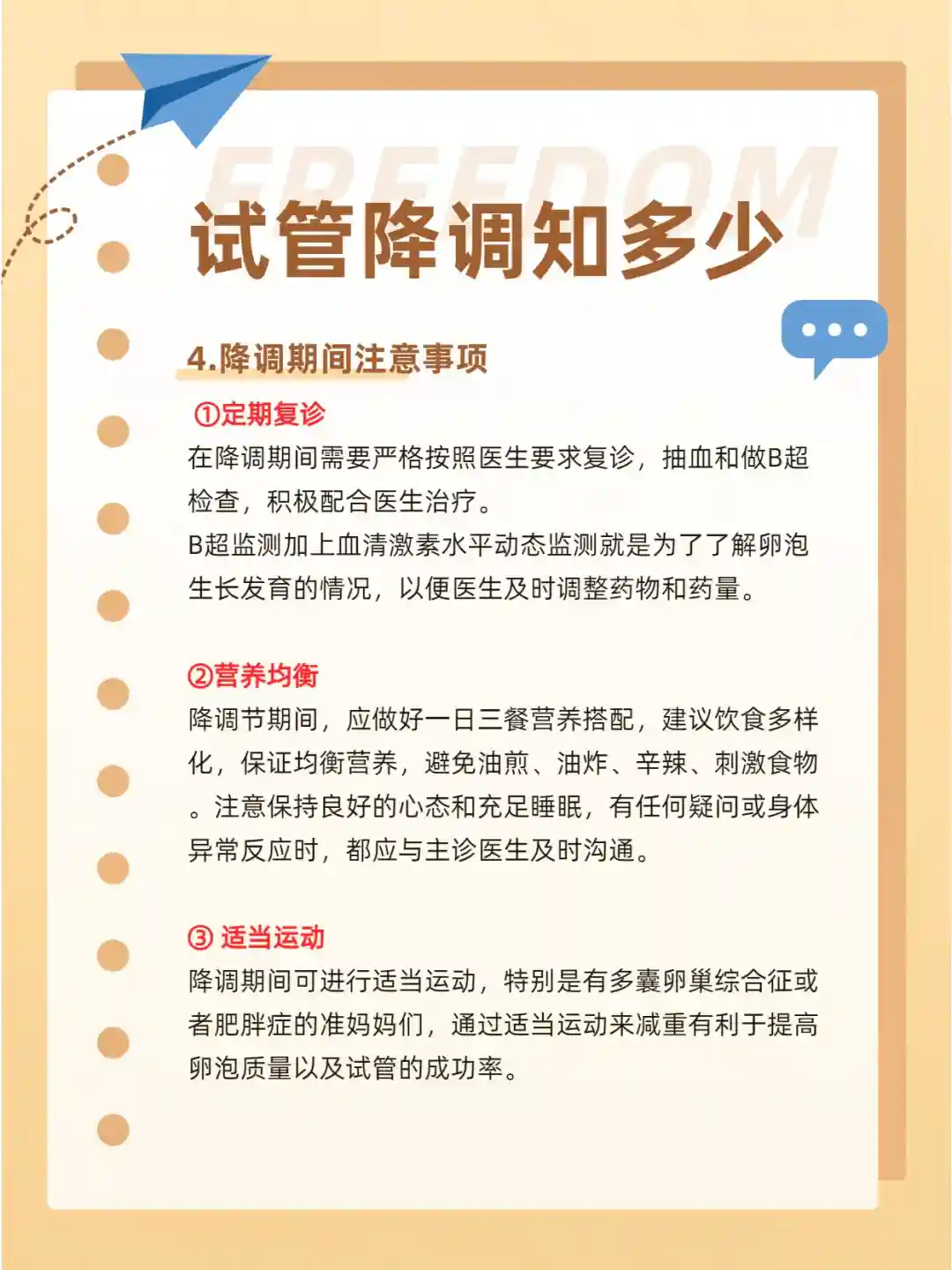 营养均衡降调节期间,应做好一日三餐营养搭配,建议饮食多样化,保证均衡营养,避免油煎、油炸、辛辣、刺激食物。注意保持良好的心态和充足睡眠,有任何疑问或身体异常反应时,都应与主诊医生及时沟通。