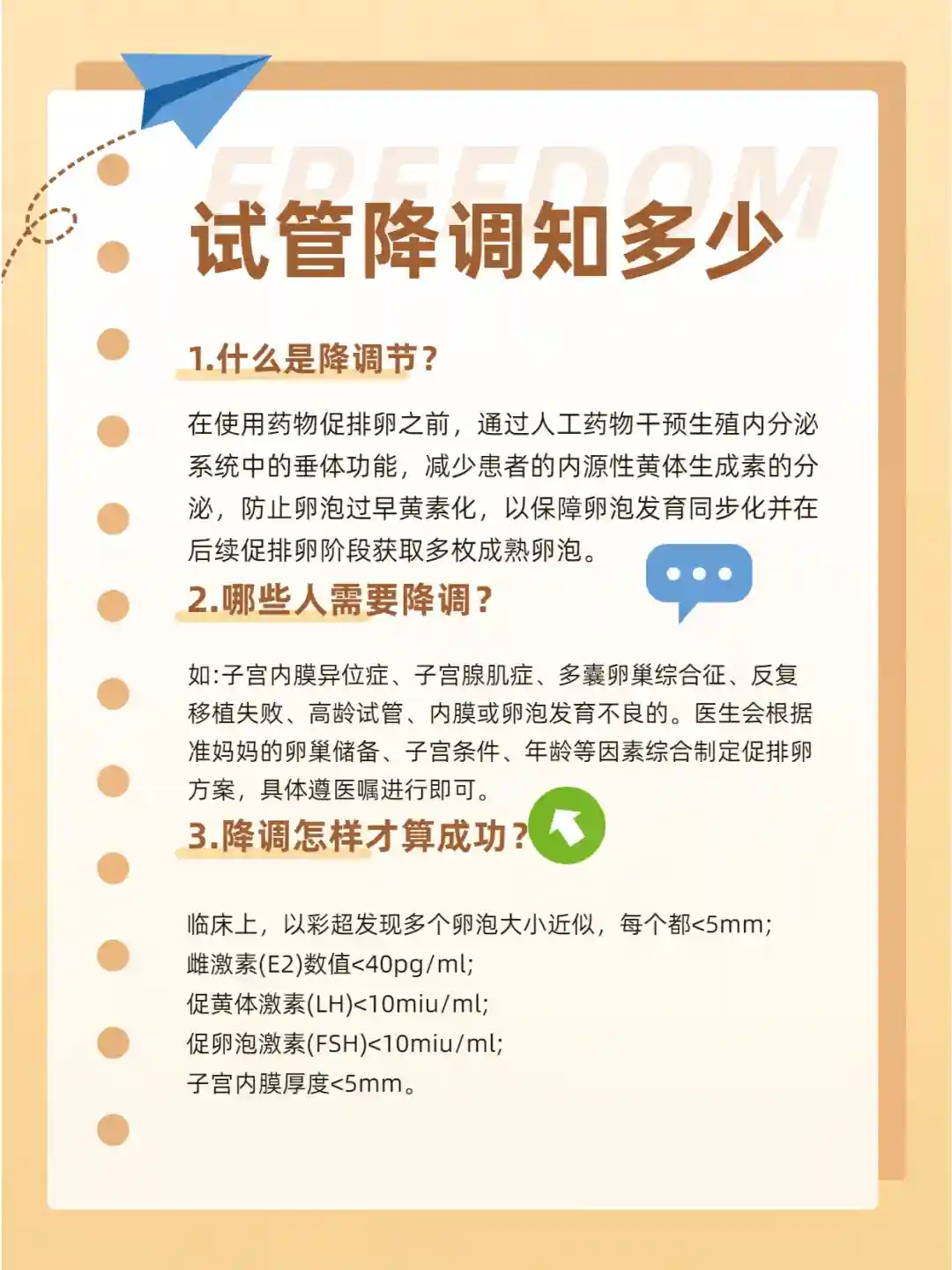 试管婴儿降调成功的主要参考因素有卵泡、体内激素水平和子宫内膜标准等指标: