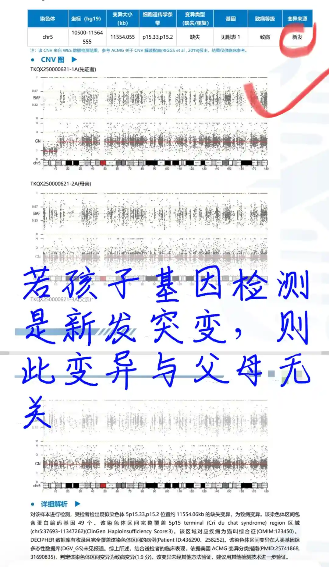12天后,全外显子检测结果出炉,显示CNV呈阳性,孩子染色体出现2处大片段变异。好在这两处变异都是新发突变,得知这一结果,孩子妈妈既为患病的孩子悲伤难过,又暗自庆幸肚子里的胎儿与一胎的情况并无关联。具体来看,变异一是受检者在染色体5p15.33、p15.2位置,检测出约11554.06kb的缺失变异,这属于致病变异,此染色体区间包含49个蛋白编码基因,也正是基于此,确诊孩子患有猫叫综合征。变异二则是受检者在染色体18q21.31、q23位置,有疑似约22617.21kb的重复变异,同样为致病变异,该区间包含59个蛋白编码基因 。