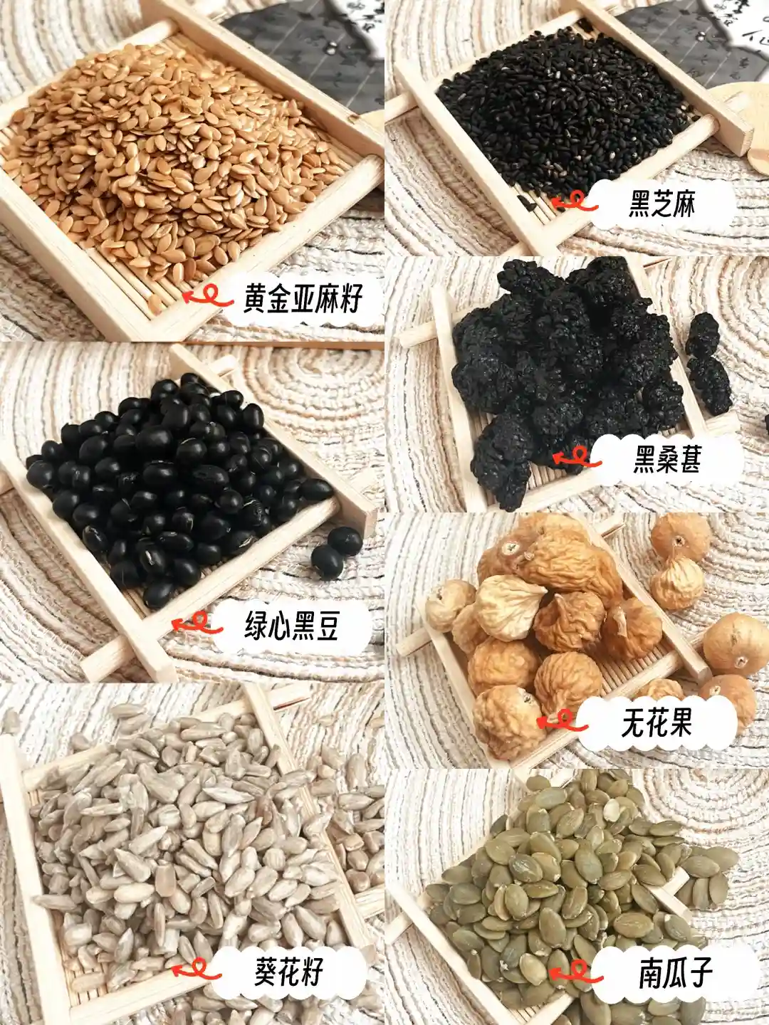 亚麻籽80g、无花果50g、南瓜子80g、葵花籽80g、黑芝麻80g、黑桑葚50g、黑豆100g