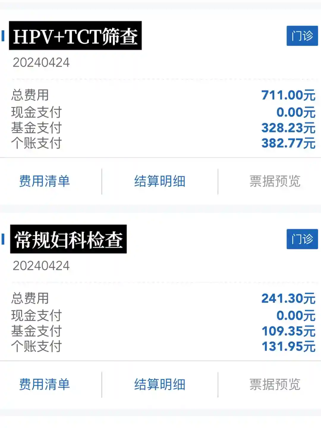HPV+TCT花费711,阴道镜114.5,常规妇科241.3