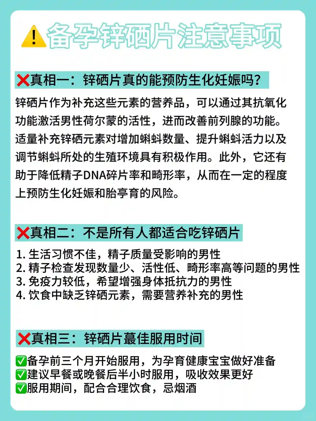 男士备孕时服用锌硒片,能够提升精子活力,降低畸形率,有助于预防生化妊娠。成年人每天建议摄入适量的锌和硒