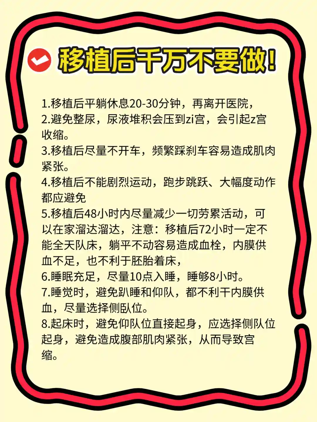 2.避免整尿,尿液堆积会压到zi宫,会引起z宫收缩。 3.移植后尽量不开车,频繁踩刹车容易造成肌肉紧张。 4.移植后不能剧烈运动,跑步跳跃、大幅度动作都应避免