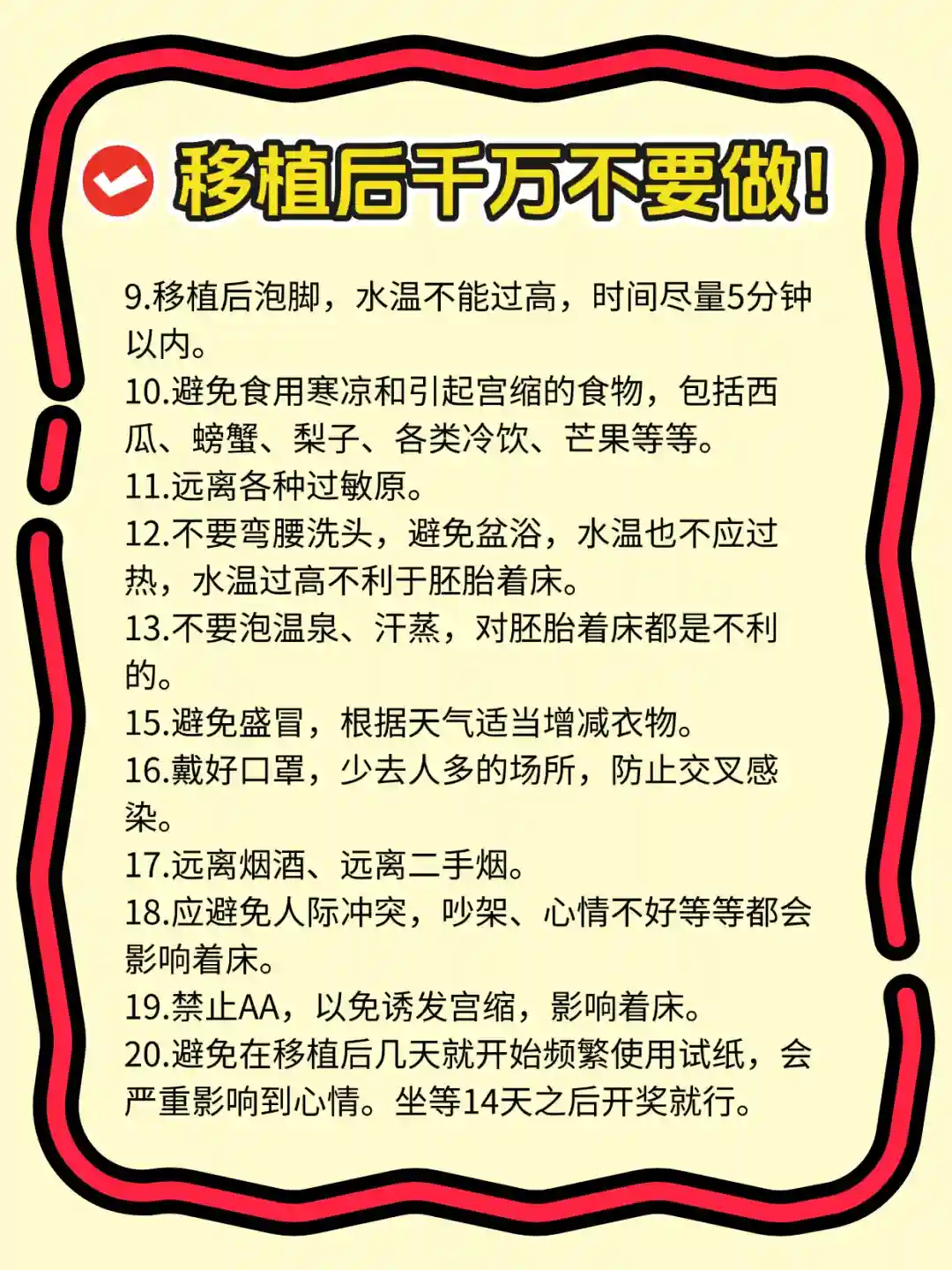 9.移植后泡脚,水温不能过高,时间尽量5分钟以内。 10.避免食用寒凉和引起宫缩的食物,包括西瓜、螃蟹、梨子、各类冷饮、芒果等等。杜绝一切咖啡和茶饮、奶茶。
