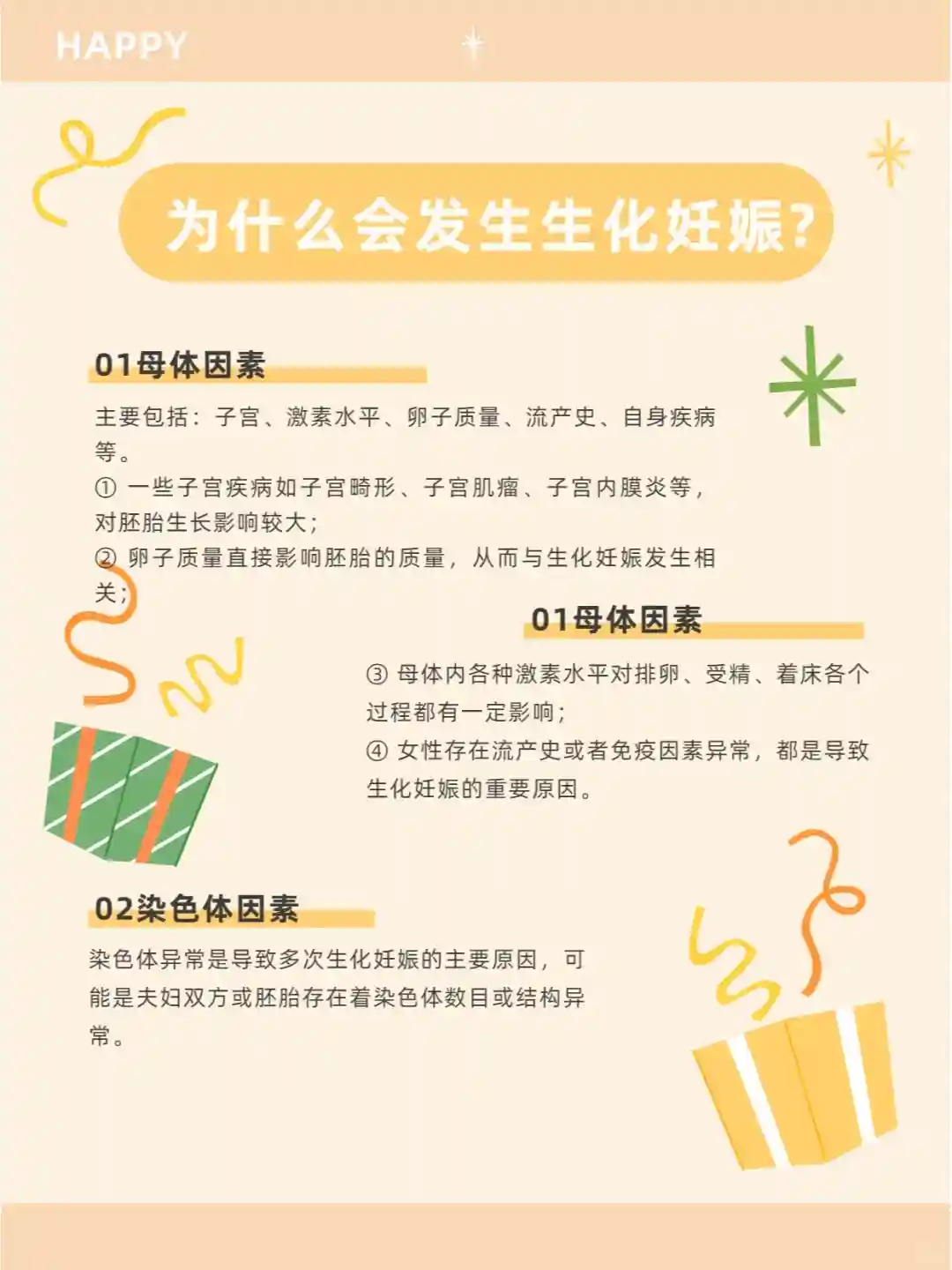 ① 一些子宫疾病如子宫畸形、子宫肌瘤、子宫内膜炎等,对胚胎生长影响较大;② 卵子质量直接影响胚胎的质量,从而与生化妊娠发生相关;