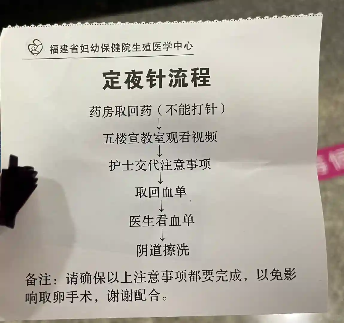 门诊做B超的时候准备进行了擦洗,定夜针之后先去药房取药,然后去5楼宣教看视频,听护士谈话,护士会给你写好晚上是几点的夜针,要遵守这个时间去打针(大概10点谈话,谈完再下去看血单)