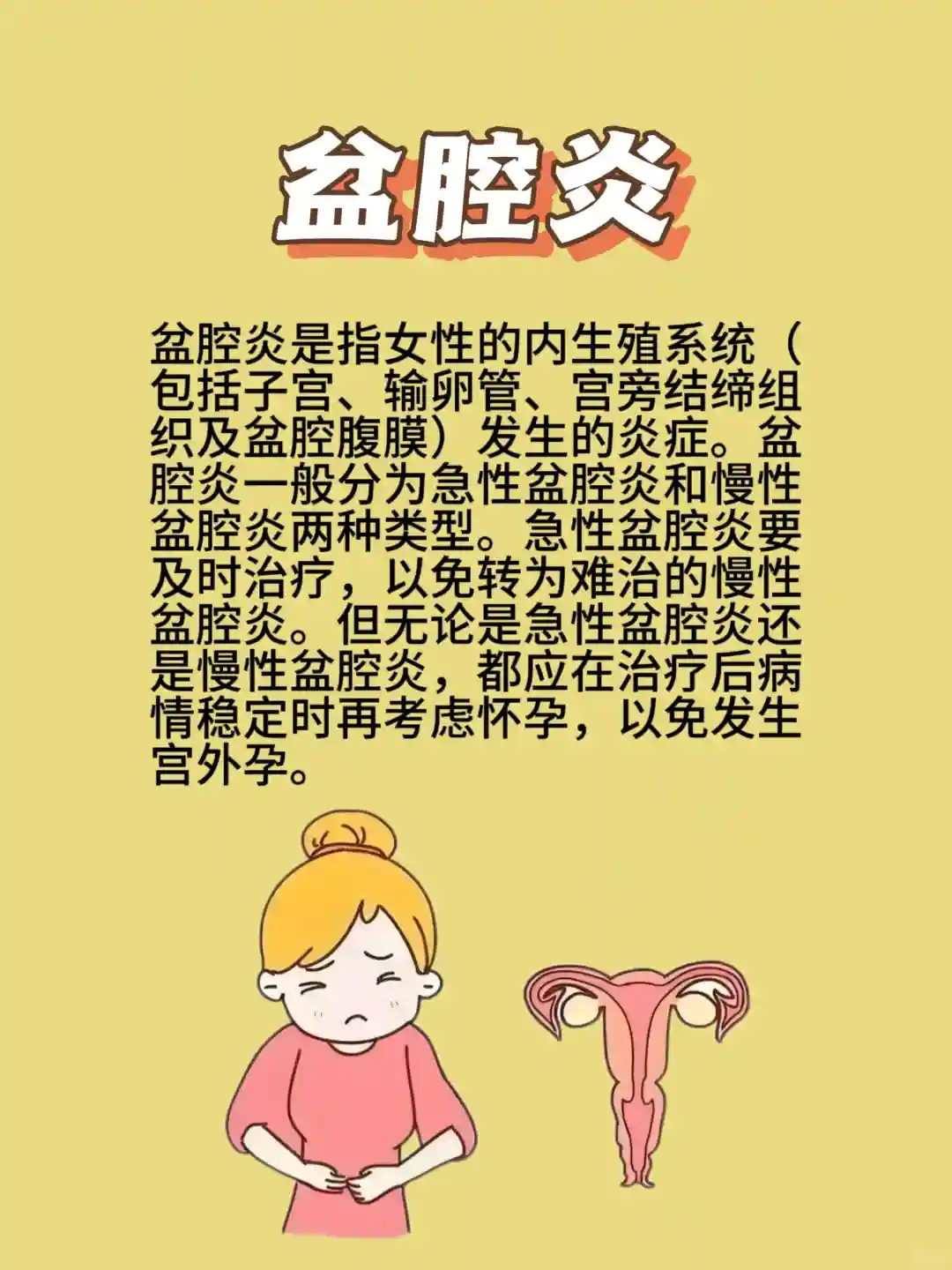 盆腔炎是指女性的内生殖系统(包括子宫、输卵管、宫旁结缔组织及盆腔腹膜)发生的炎症。盆腔炎一般分为急性盆腔炎和慢性盆腔炎两种类型。急性盆腔炎要及时治疗,以免转为难治的慢性盆腔炎。但无论是急性盆腔炎还是慢性盆腔炎,都应在治疗后病情稳定时再考虑怀孕,以免发生宫外孕。