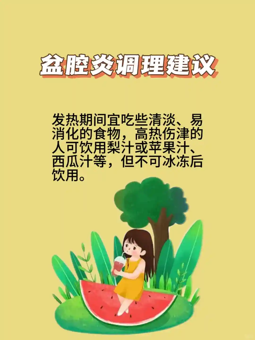 🌱发热期间宜吃些清淡、易消化的食物,高热伤津的人可饮用梨汁或苹果汁、西瓜汁等,但不可冰冻后饮用。