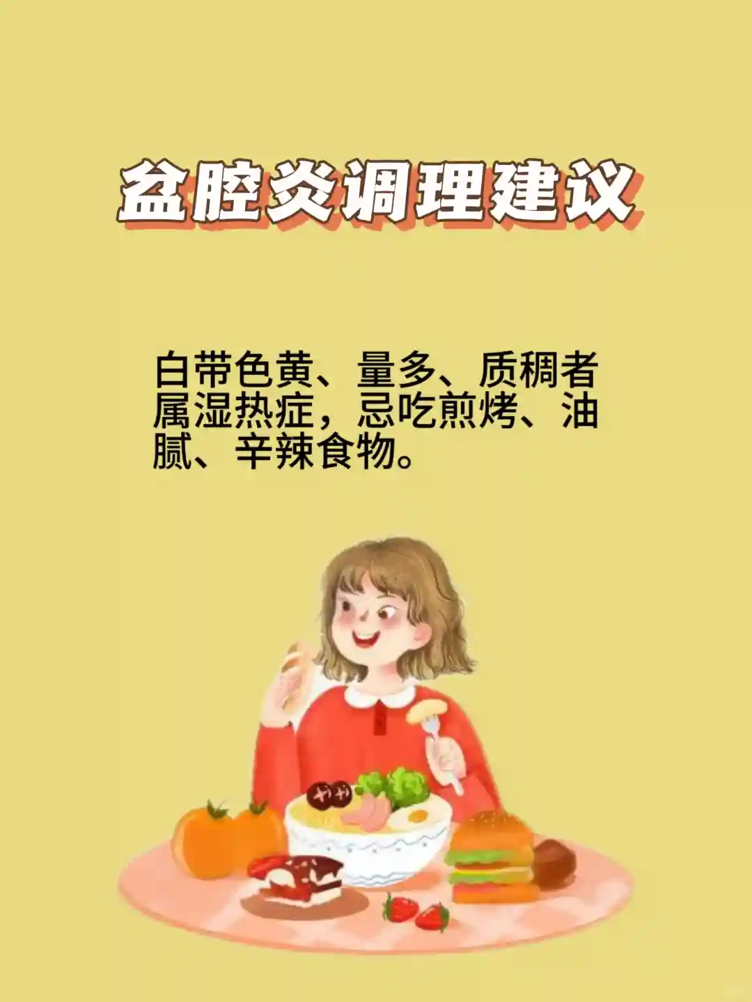 🌱白带色黄、量多、质稠者属湿热症,忌吃煎烤、油腻、辛辣食物。