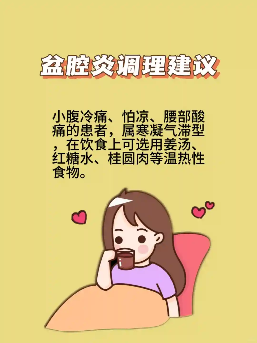 🌱小腹冷痛、怕凉、腰部酸痛的患者,属寒凝气滞型,在饮食上可选用姜汤、红糖水、桂圆肉等温热性食物。