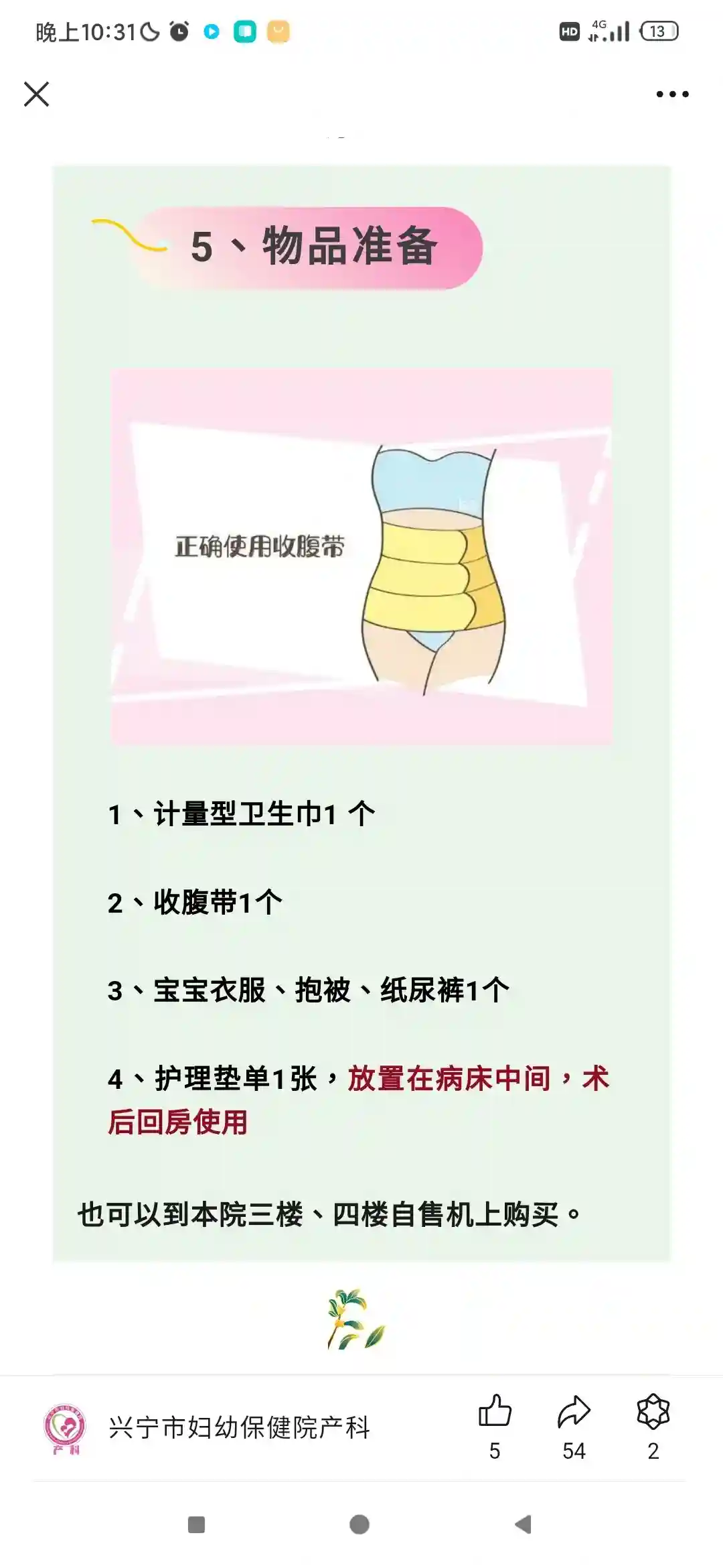 ps:1 准备用物中,一次性便盆,怕痛的姐妹可以准备,在阵痛的时候可以用便盆,就不用一次次去厕所了,衣架睡衣那些,看个人;顺产住24小时,剖腹产住4天,我在住院期间全程穿病人服,没用上,甚至后悔没有准备好出院穿的衣服,我就准备了睡衣和睡袍,尴尬死了,幸好我多准备了披风,不然就穿着睡衣出院了