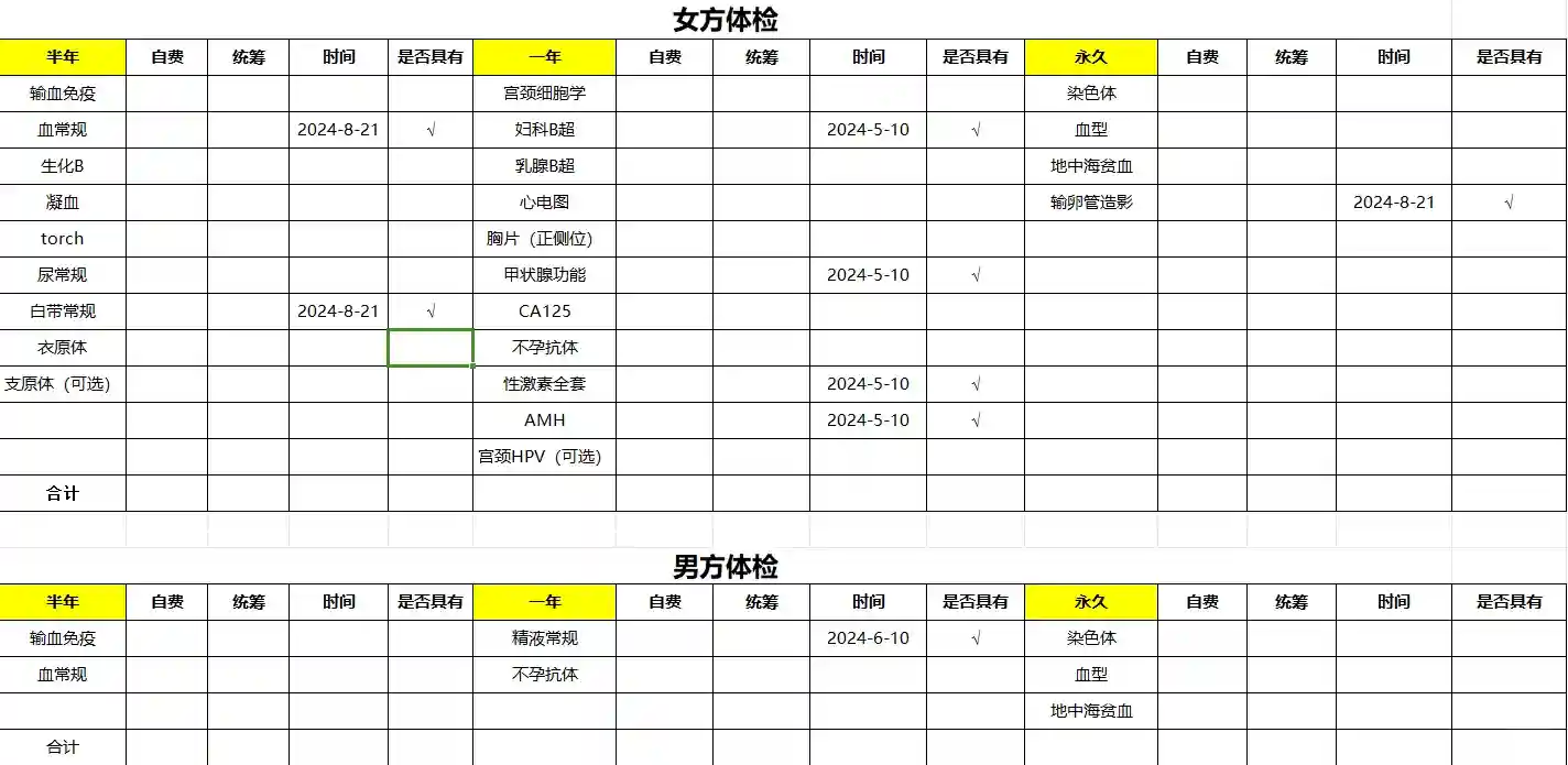 在2024.11.30,正好是周六,经期结束第三天,挂了三医院妇科开了男女双方二次的检查(女方:输血免疫、生化B、凝血、torch、尿常规、白带常规、衣原体、宫颈细胞学、乳腺B超、心电图、胸片(正侧位)、CA125、宫颈HPV,男方:输血免疫、血常规)大概金额女1900+男400元,合计2300元(这个统筹了800元左右),自费1500元,做这个体检我们相当于一共自费了3200元,但不包含我们原来有的部分在有效期的报告(血常规、甲状腺功能、性激素全套、妇科B超、AMH、输卵管造影,男方精液常规)