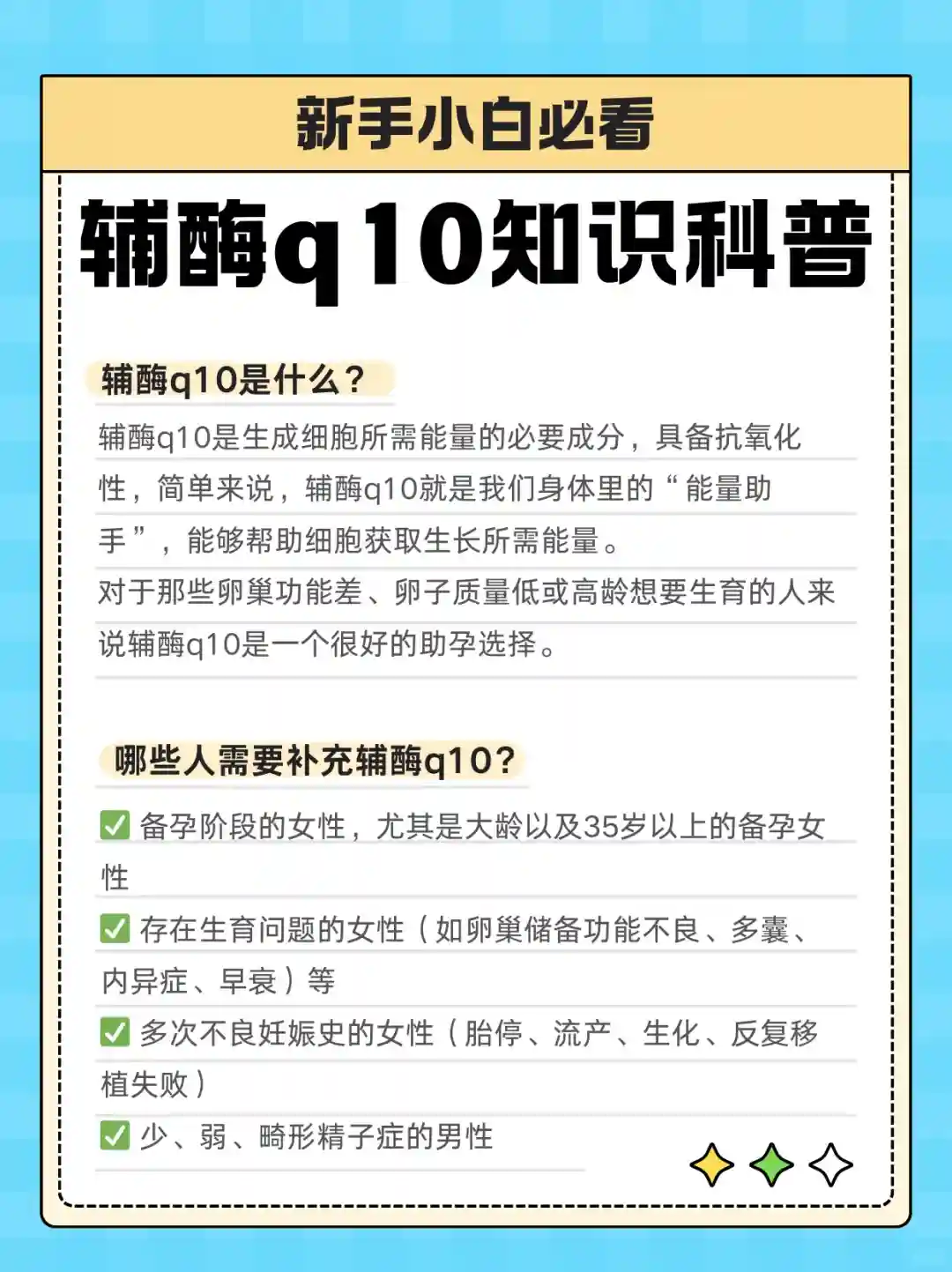 辅酶q10简单来说,就是我们身体里的“能量助手”,能够帮助细胞获取生长所需能量。对于那些卵巢功能差、卵子质量低或高龄想要生育的人来说辅酶q10是一个很好的助孕选择。