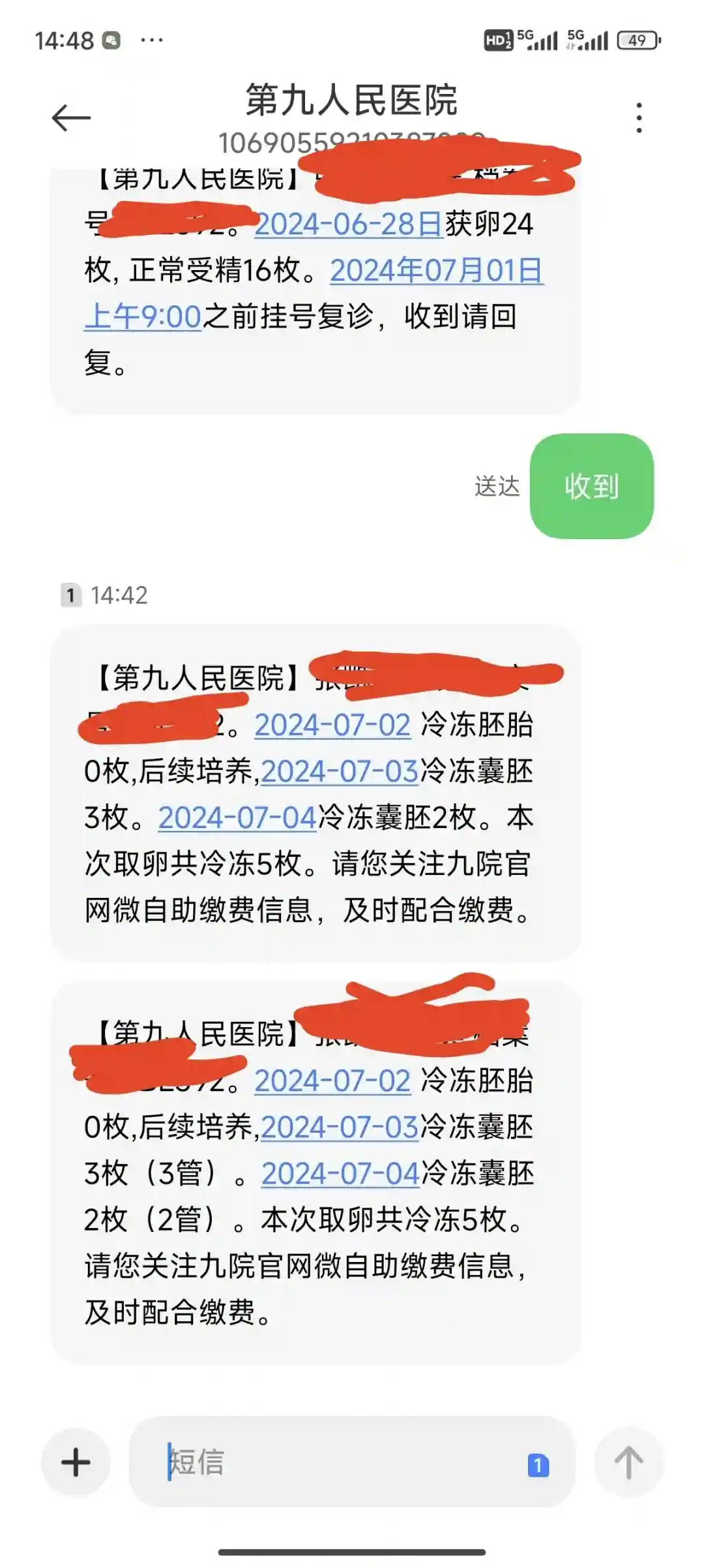 6⃣月2⃣9⃣日下午三点半左右收到短信通知,枚受精成功