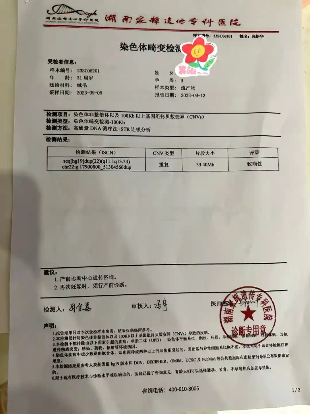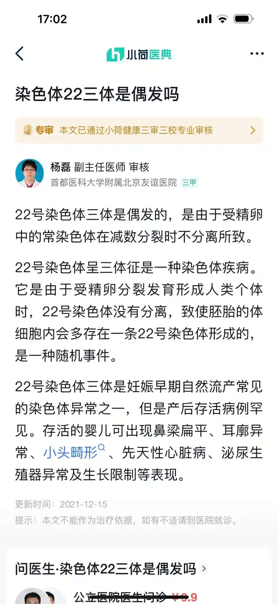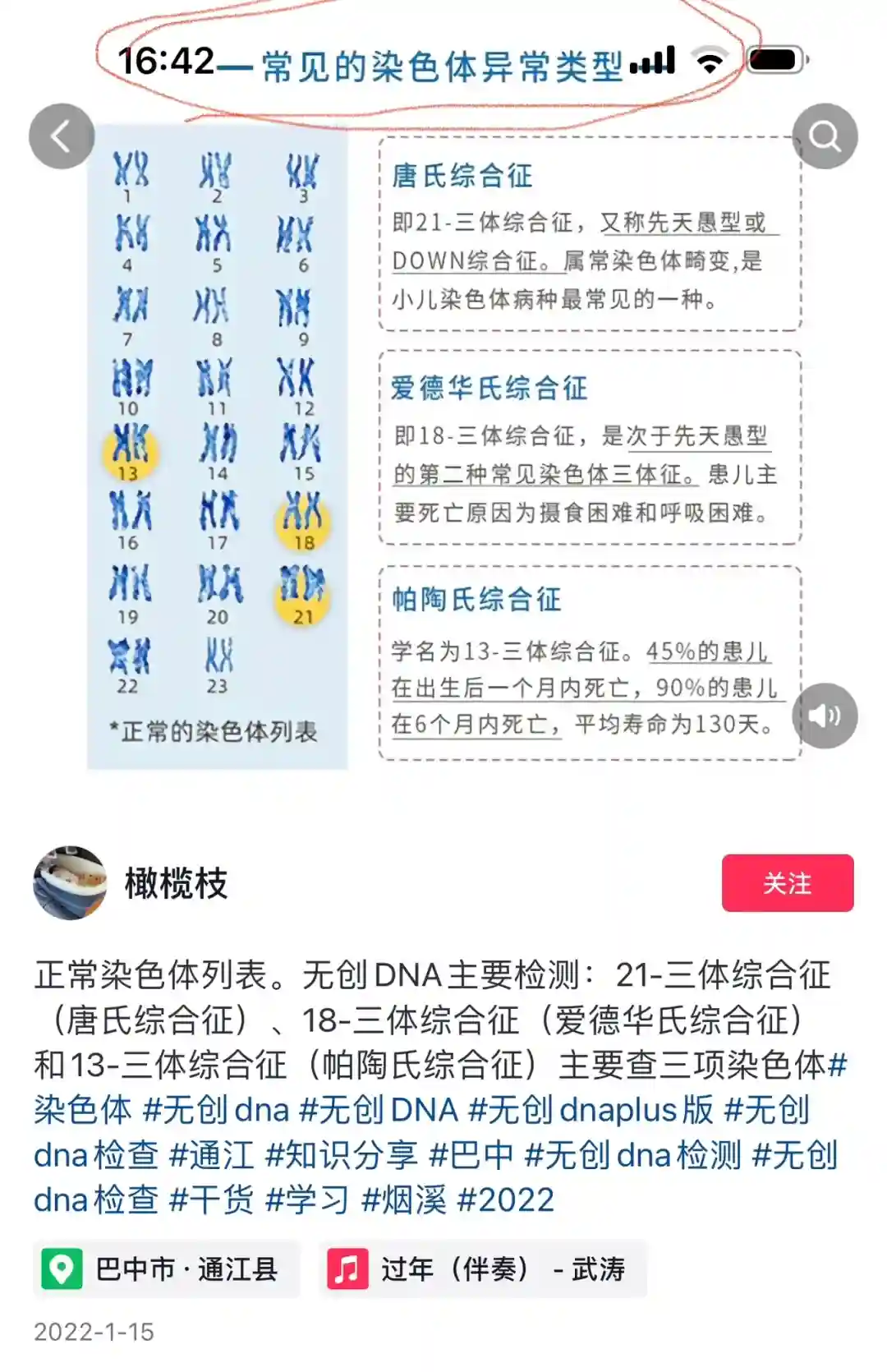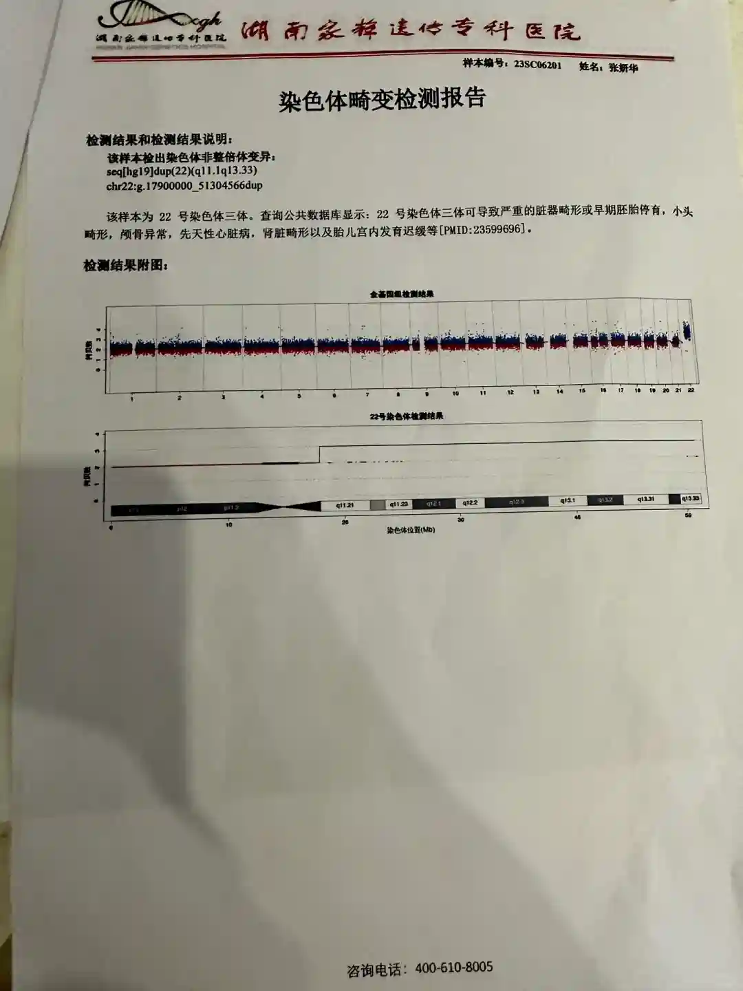 花了两千七百多做了胚胎染色体检测报告两张纸,结果是22号染色体三体原因导致胎停的。自己又百度抖音搜索查了一下具体原因,亏的是二胎,内心还抗压一些。总结一下就准备要孩子的有条件的提前夫妻做一下染色体检查和孕前健康体检对自己负责少受罪;人身体一共有23对染色体,糖筛检测是孕妈必不可少的检查项目也叫做21染色体,你也不知道踩到那个雷区,毕竟是自然法则中的优胜略汰,你好我好大家好。养身体多运动调整心态,对22号染色体三体“霉孕”说拜拜.