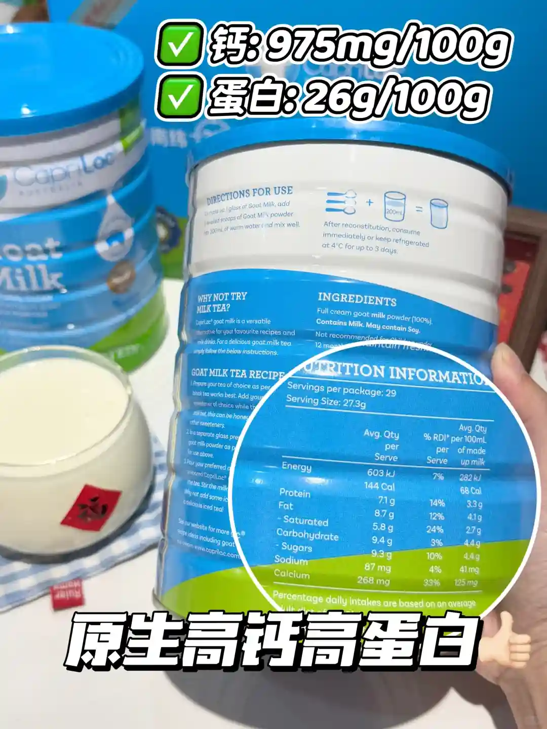 我爷爷奶奶年纪一大把,我经常担心他们走路摔跤。羊奶简直就是中老年的“守护💎藏”,它是优质的钙来源。这款佳倍营羊奶粉每100g钙含量高达975mg,如同一个天然的钙质小金库,每100g含有26g蛋白质。做到真正的原生高钙高蛋白!把好营养牢牢锁住!!