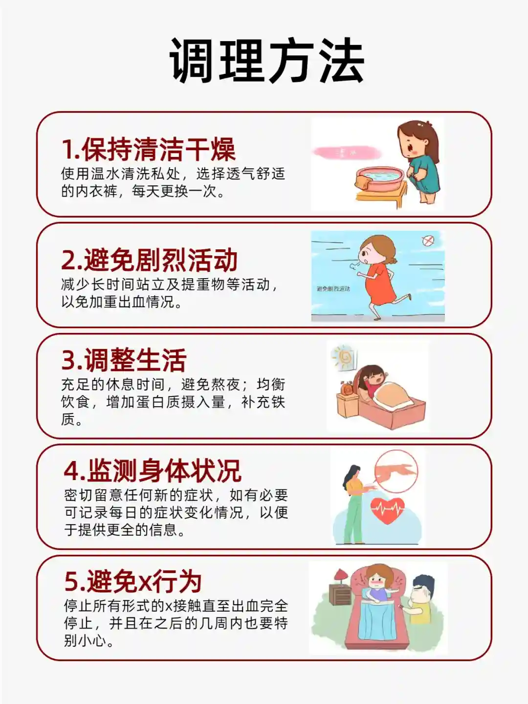 使用温水清洗私处,选择透气舒适的内衣裤,每天更换一次。2.避免剧烈活动