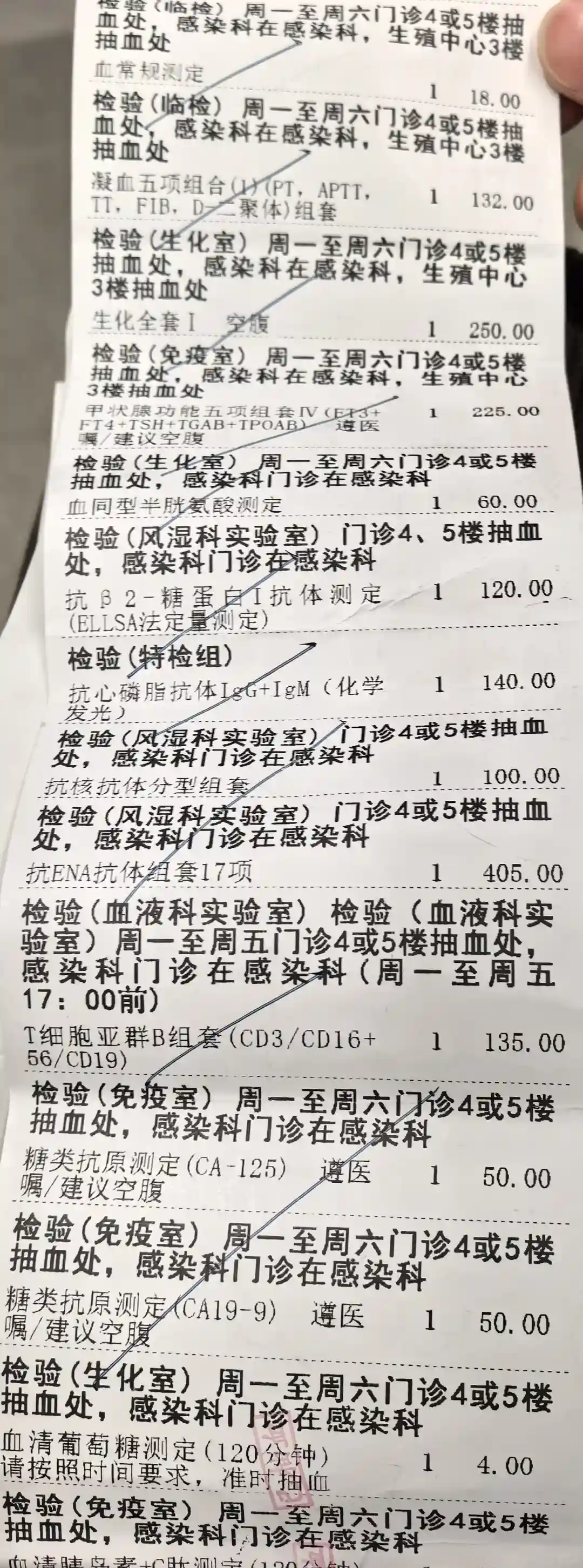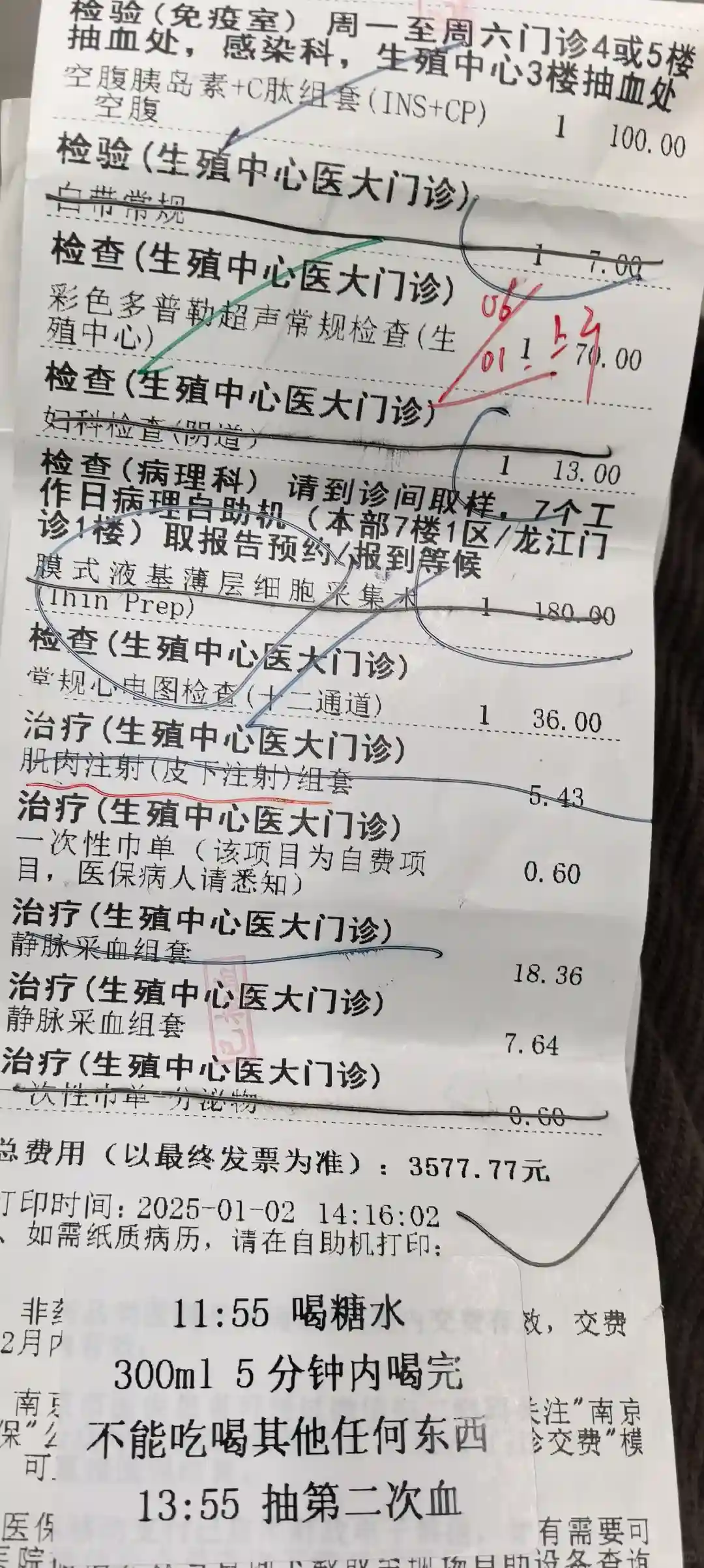 第一次打尿促的时候,医生给加了生长激素,自费500多,后面现在的医生给取消了。最后一个周期的时候,我感觉不是很好,所以同步开始做试管的前期检查,检查单一摞,抽血十几管。当然他也得做,但相对少很多