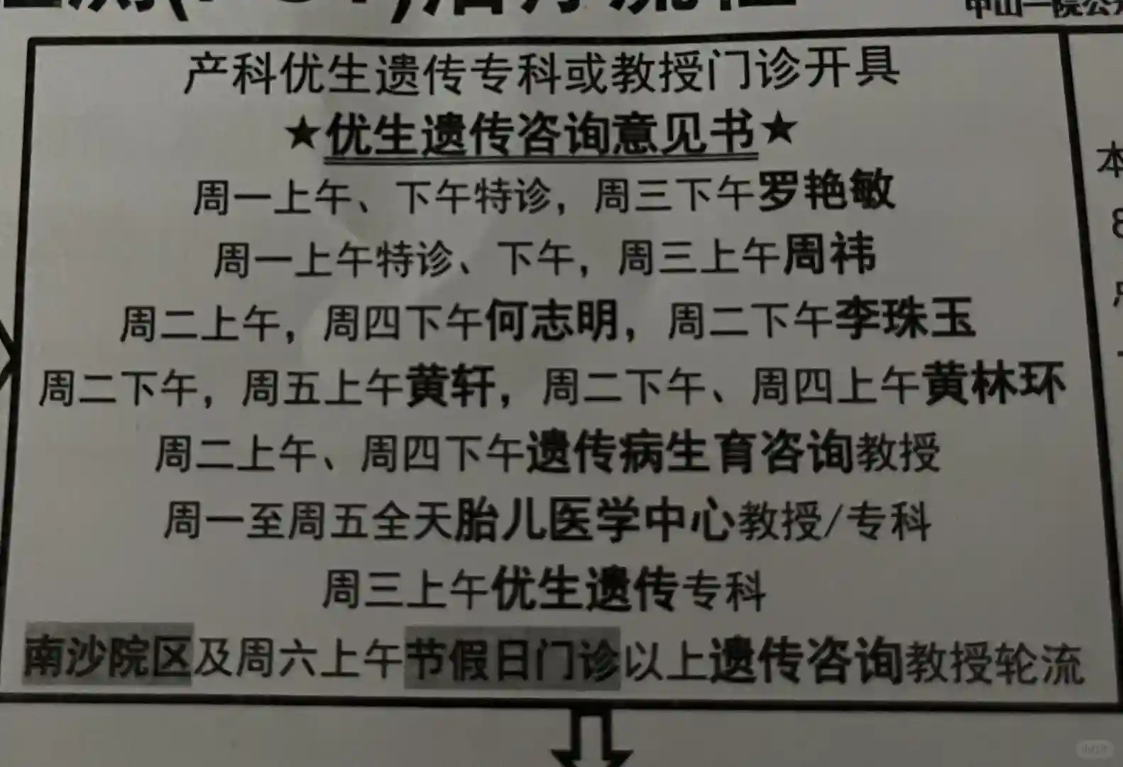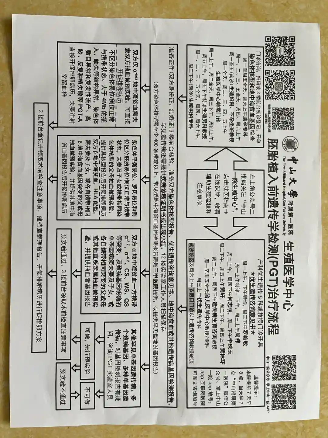 第一步先去挂产科优生遗传专科或者教授门诊开具*优生遗传咨询意见书*,我挂的是产科优生遗传专科的医生,需要耐心的等待,医生是一边做手术一边看诊。如果你有染色体报告(需要大于400条带),基因全外显报告,地中海贫血的基因检测报告就带上,没有医生会开,染色体和全外显报告大概一个月出结果,还开了抽血检查和血型,等到所有结果出来再挂号,医生会根据结果开具意见书。三代又分三种胚胎植入前遗传学检测:PGT-M(单基因遗传病)、PGT-SR(染色体结构变异)、PGT-A(胚胎非整倍性)。拿到*优生遗传意见书*就可以挂生殖妇科教授看诊了,如果是地中海贫血携带基因的需要到12楼做预实验,需要家系的样本(夫妻双方和其双方父母外周血样本,或者夫妻双方和其子代外周血或流产物样本),预实验大概一个月出结果。