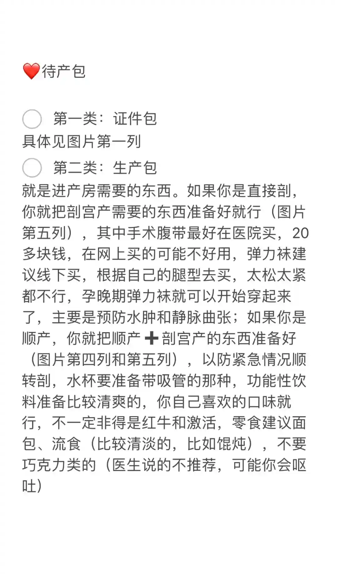 就是进产房需要的东西。如果你是直接剖,你就把剖宫产需要的东西准备好就行(图片第五列),其中手术腹带最好在医院买,20多块钱,在网上买的可能不好用,弹力袜建议线下买,根据自己的腿型去买,太松太紧都不行,孕晚期弹力袜就可以开始穿起来了,主要是预防水肿和静脉曲张;如果你是顺产,你就把顺产➕剖宫产的东西准备好(图片第四列和第五列),以防紧急情况顺转剖,水杯要准备带吸管的那种,功能性饮料准备比较清爽的,你自己喜欢的口味就行,不一定非得是红牛和激活,零食建议面包、流食(比较清淡的,比如馄炖),不要巧克力类的(医生说的不推荐,可能你会呕吐)