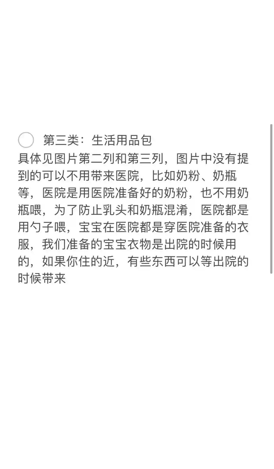 具体见图片第二列和第三列,图片中没有提到的可以不用带来医院,比如奶粉、奶瓶等,医院是用医院准备好的奶粉,也不用奶瓶喂,为了防止乳头和奶瓶混淆,医院都是用勺子喂,宝宝在医院都是穿医院准备的衣服,我们准备的宝宝衣物是出院的时候用的,如果你住的近,有些东西可以等出院的时候带来