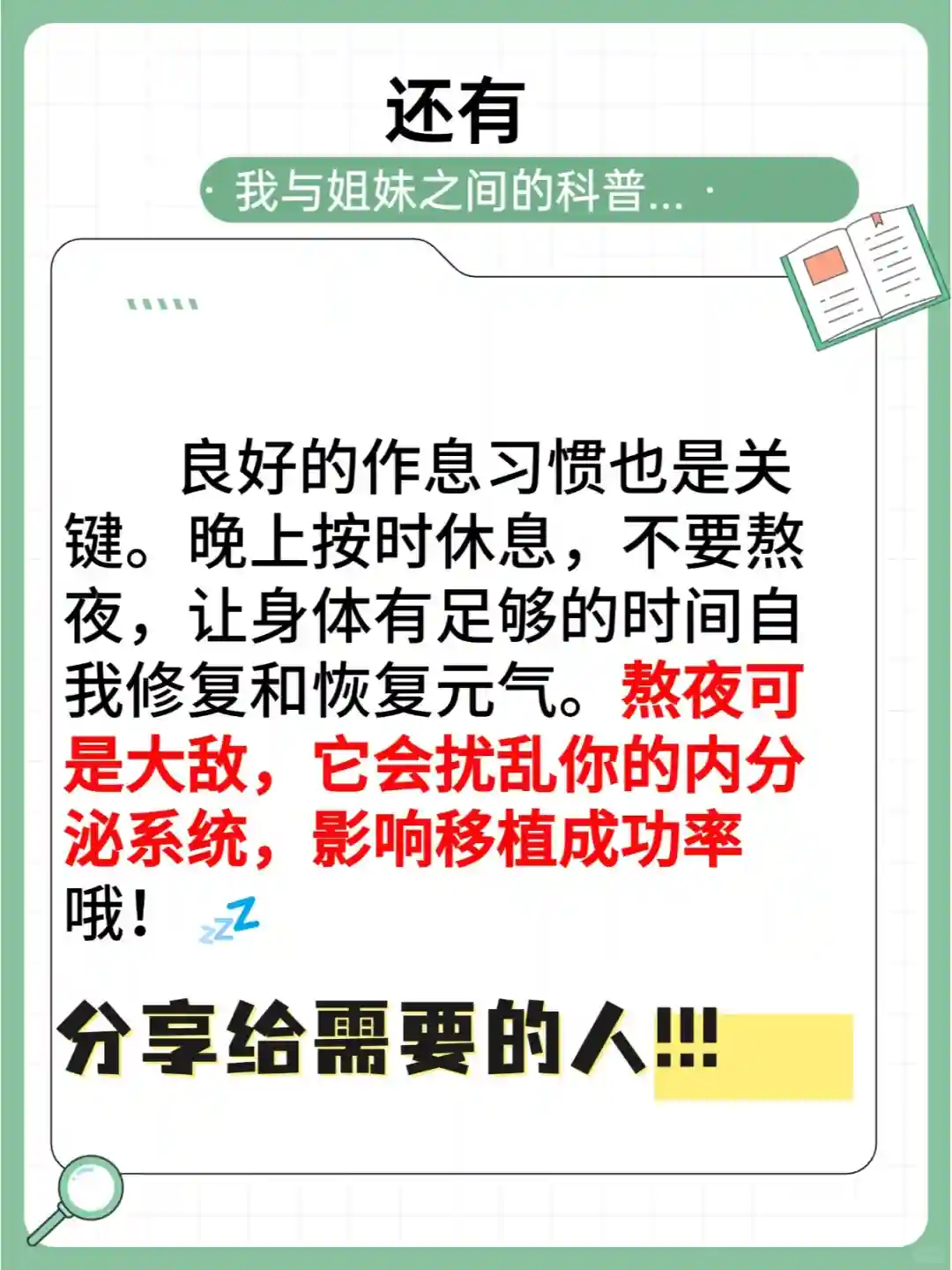 还有啊,良好的作息习惯也是关键。晚上按时休息,不要熬夜,让身体有足够的时间自我修复和恢复元气。熬夜可是大敌,它会扰乱你的内分泌系统,影响移植成功率哦!💤