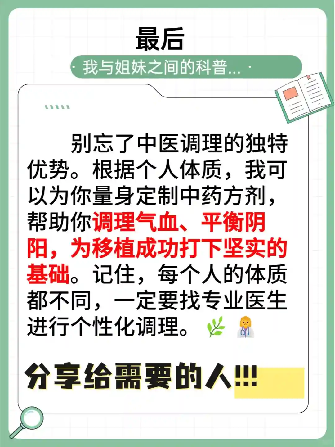 最后,别忘了中医调理的独特优势。根据个人体质,我可以为你量身定制中药方剂,帮助你调理气血、平衡阴阳,为移植成功打下坚实的基础。记住,每个人的体质都不同,一定要找专业医生进行个性化调理。🌿👩⚕️