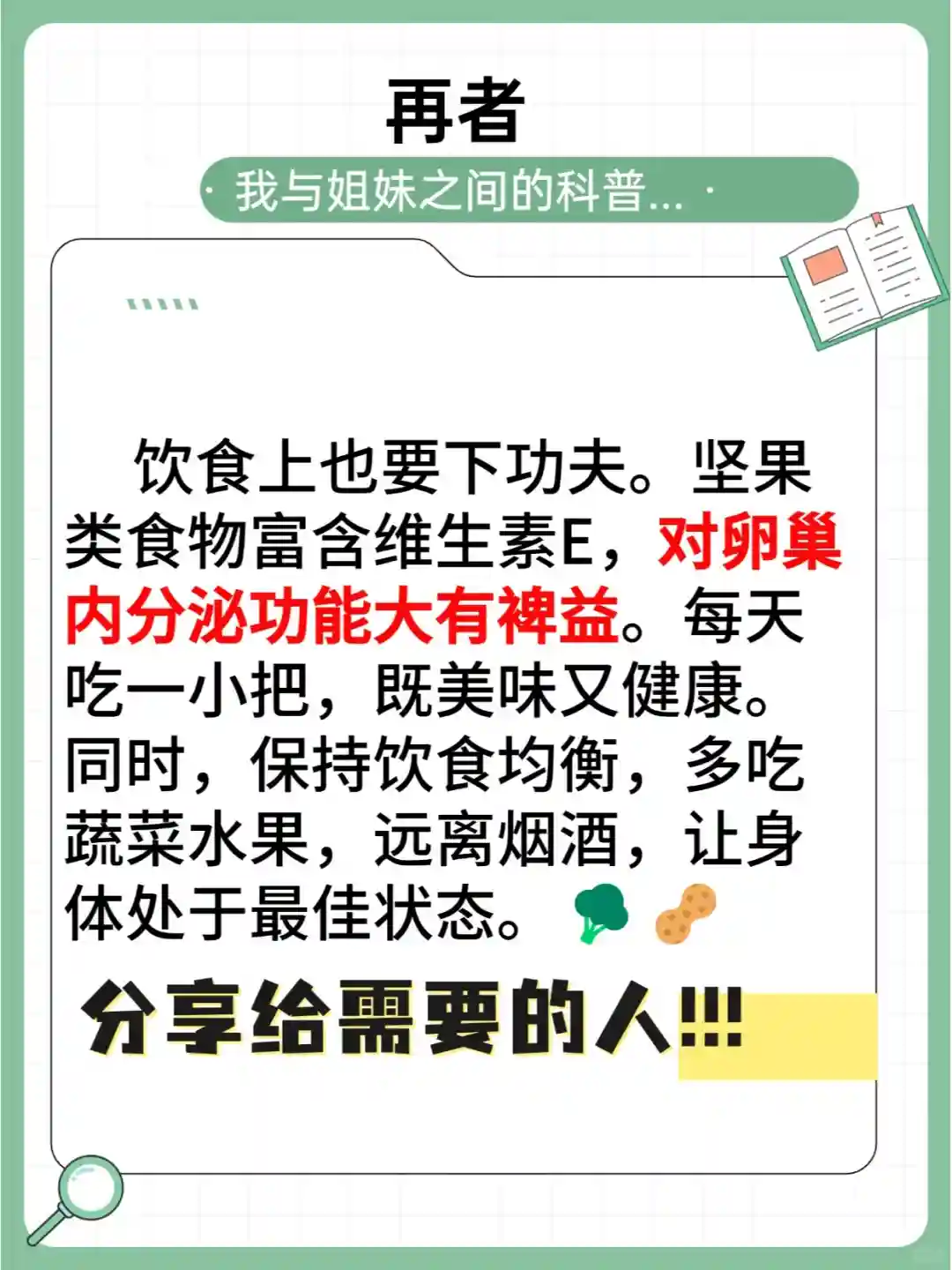 再来,饮食上也要下功夫。坚果类食物富含维生素E,对卵巢内分泌功能大有裨益。每天吃一小把,既美味又健康。同时,保持饮食均衡,多吃蔬菜水果,远离烟酒,让身体处于最佳状态。🥦🥜